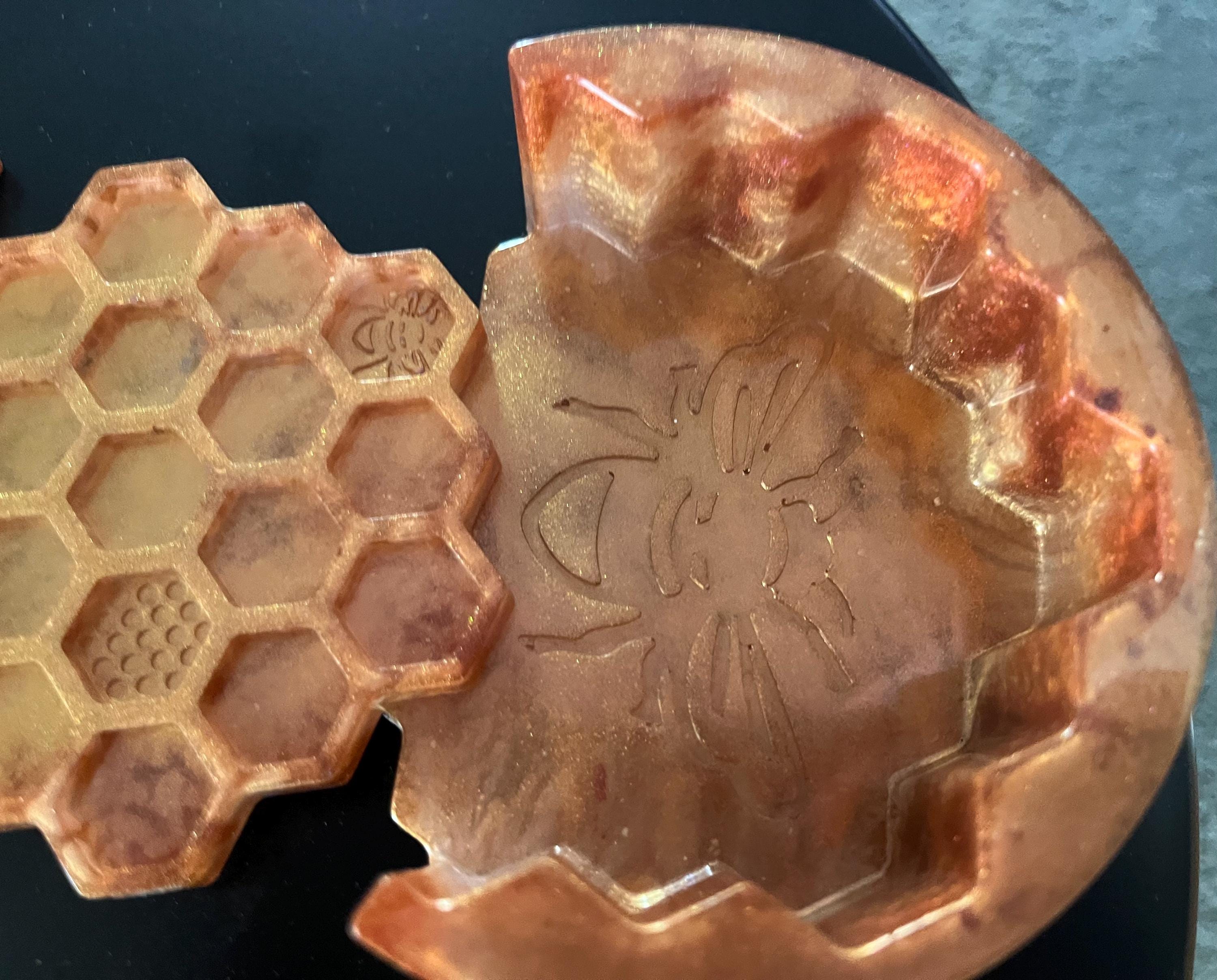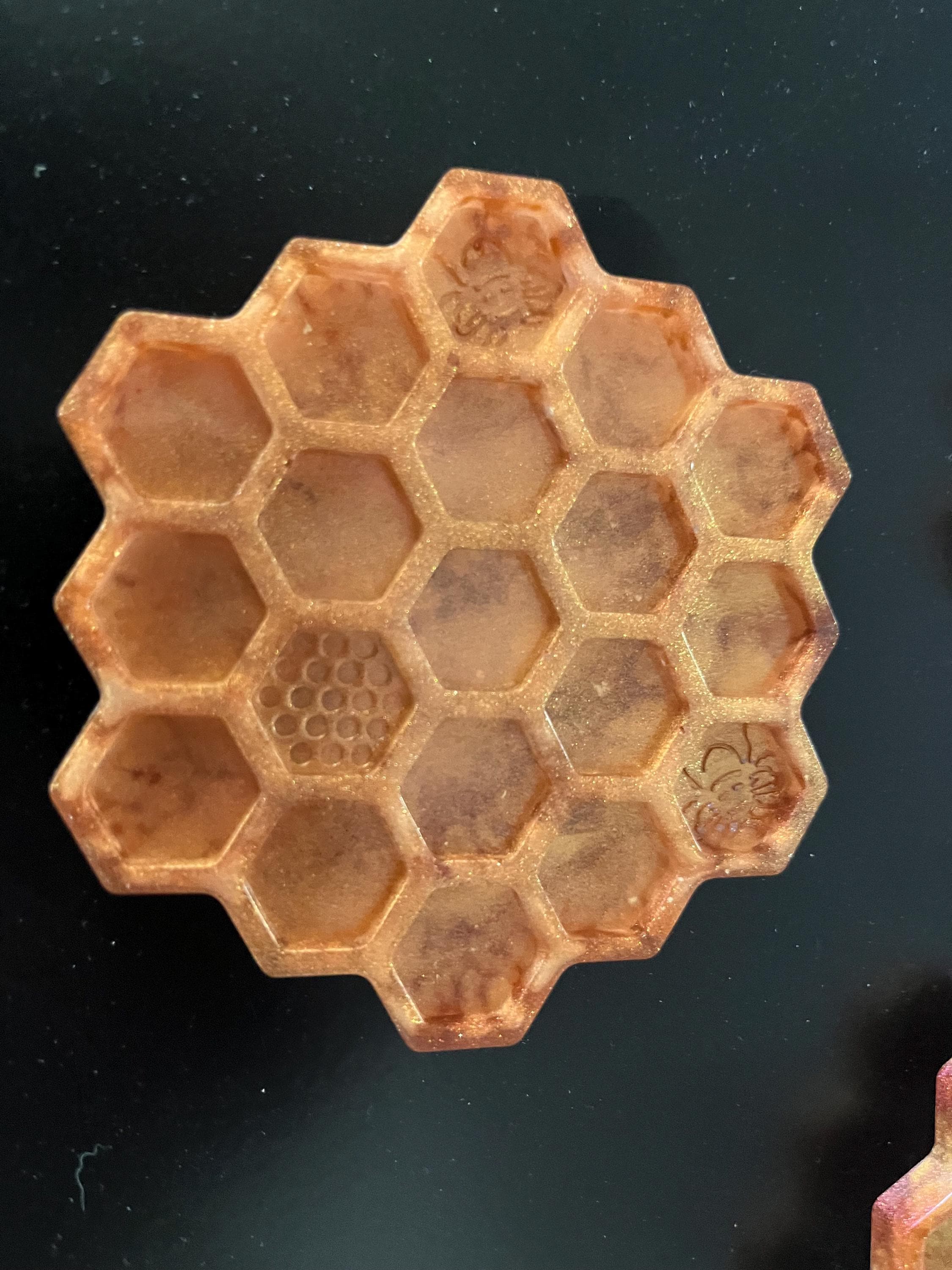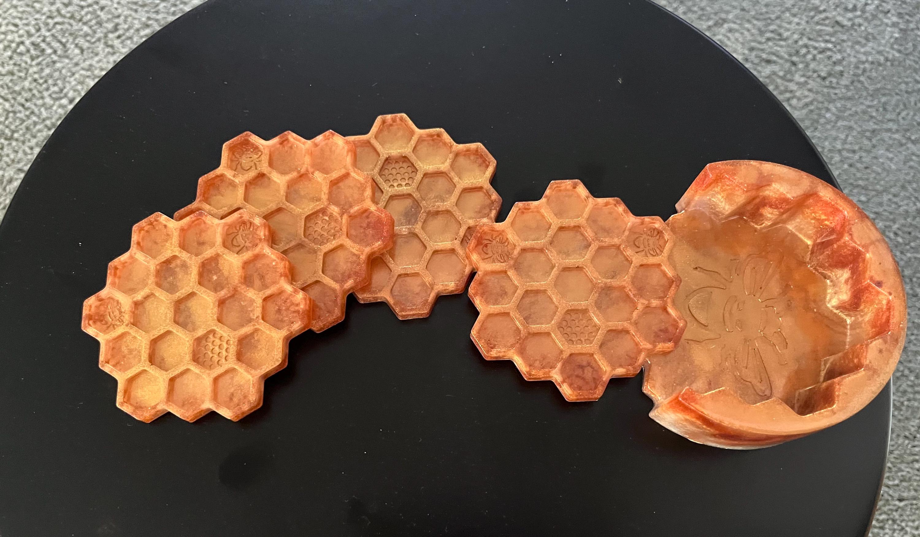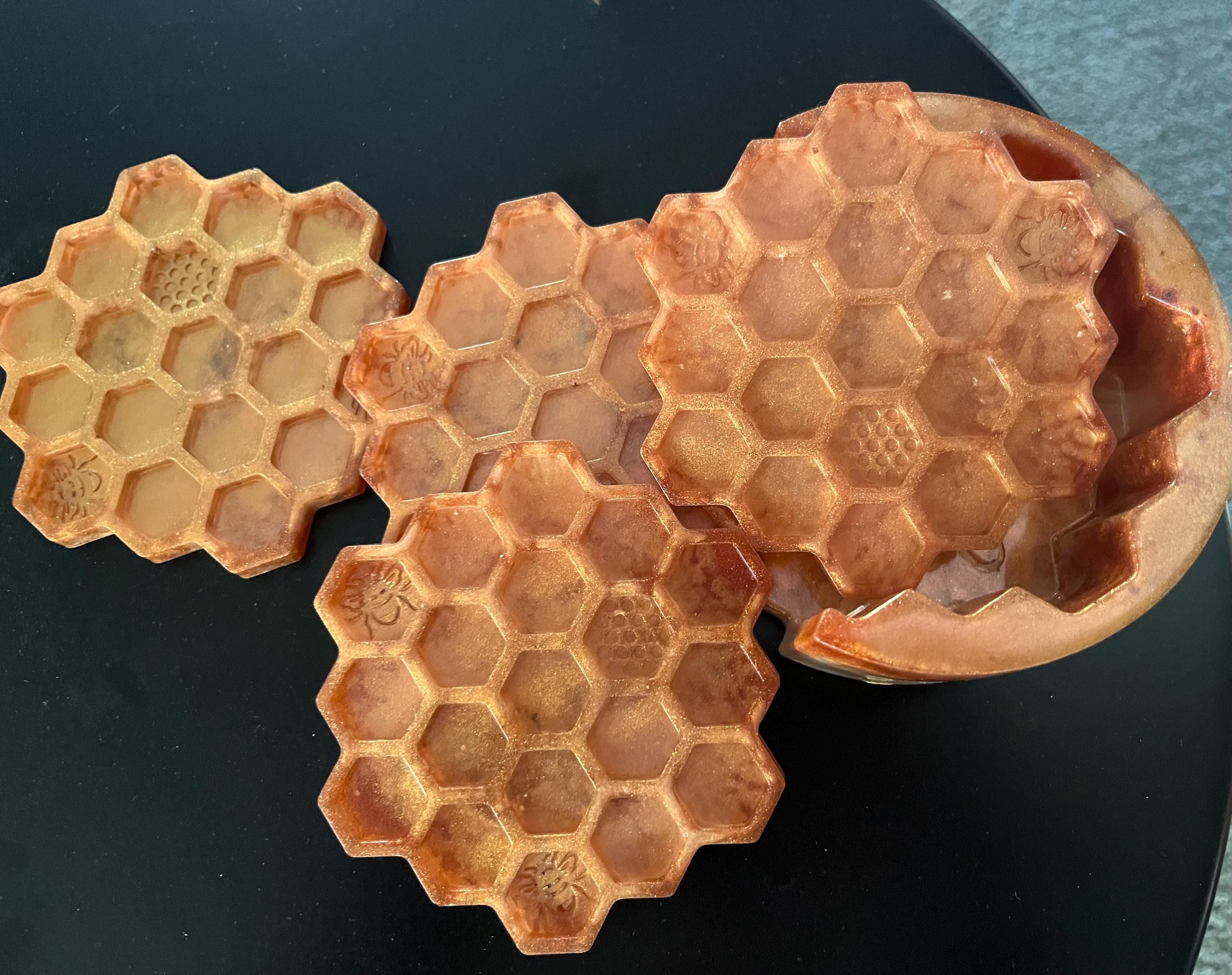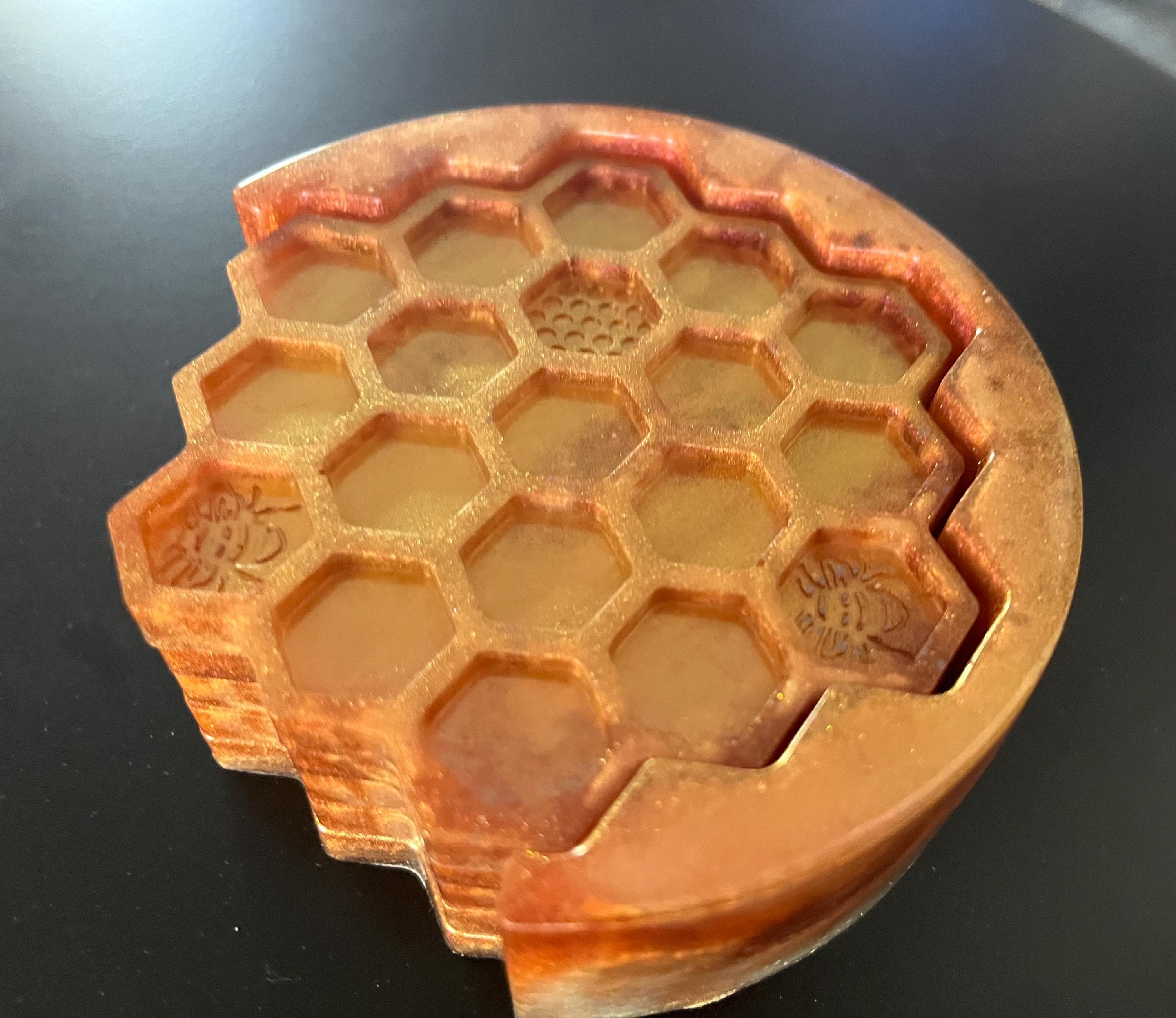 Handmade resin coasters set of 4 with holder. Honeycomb and bee themed colors are translucent yellow, light orange and yellow mixed together to give these a unique feel and are one of a kind. Makes a beautiful gift and gives a personal touch to your home or office.