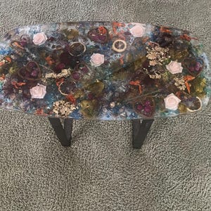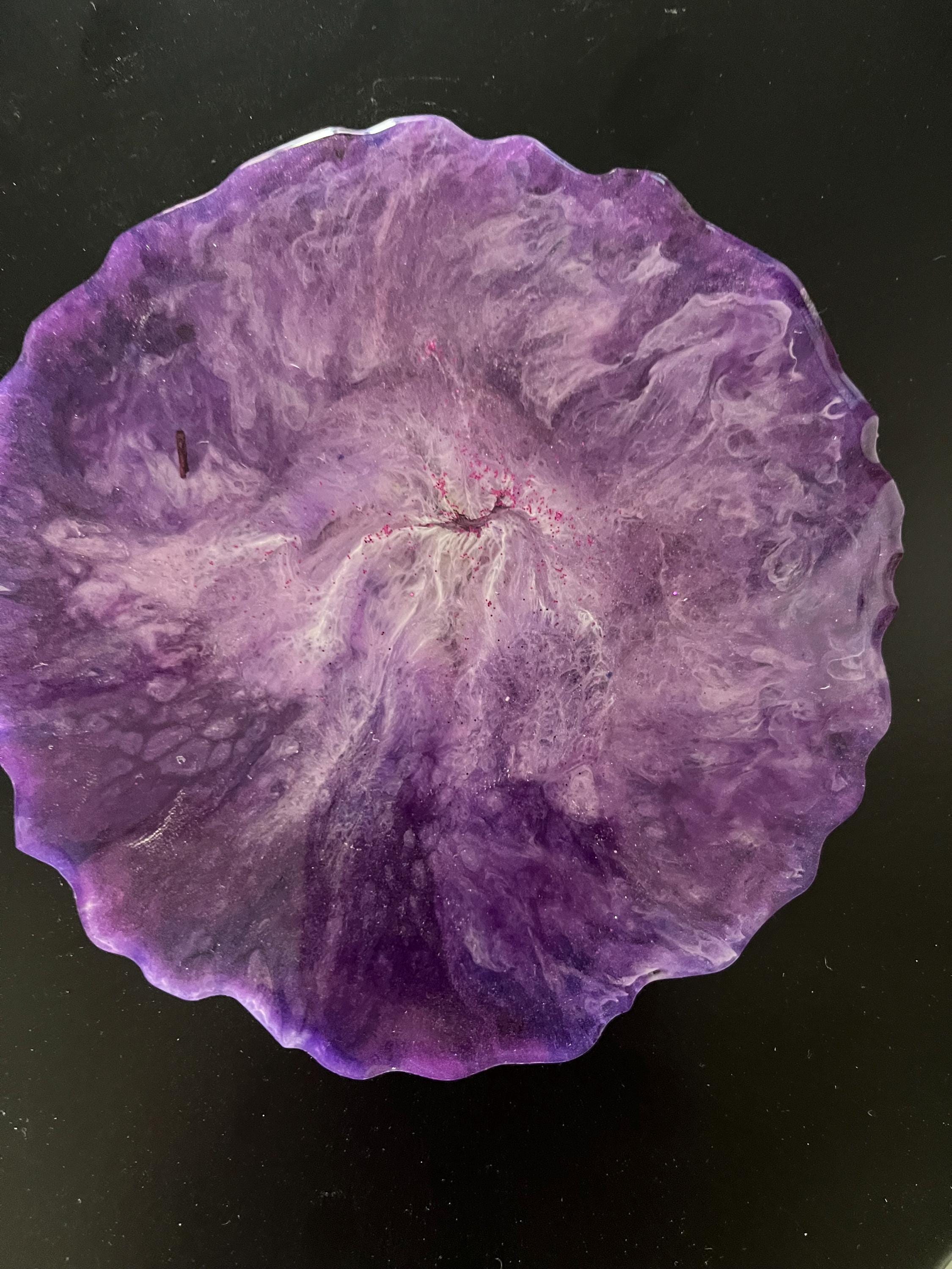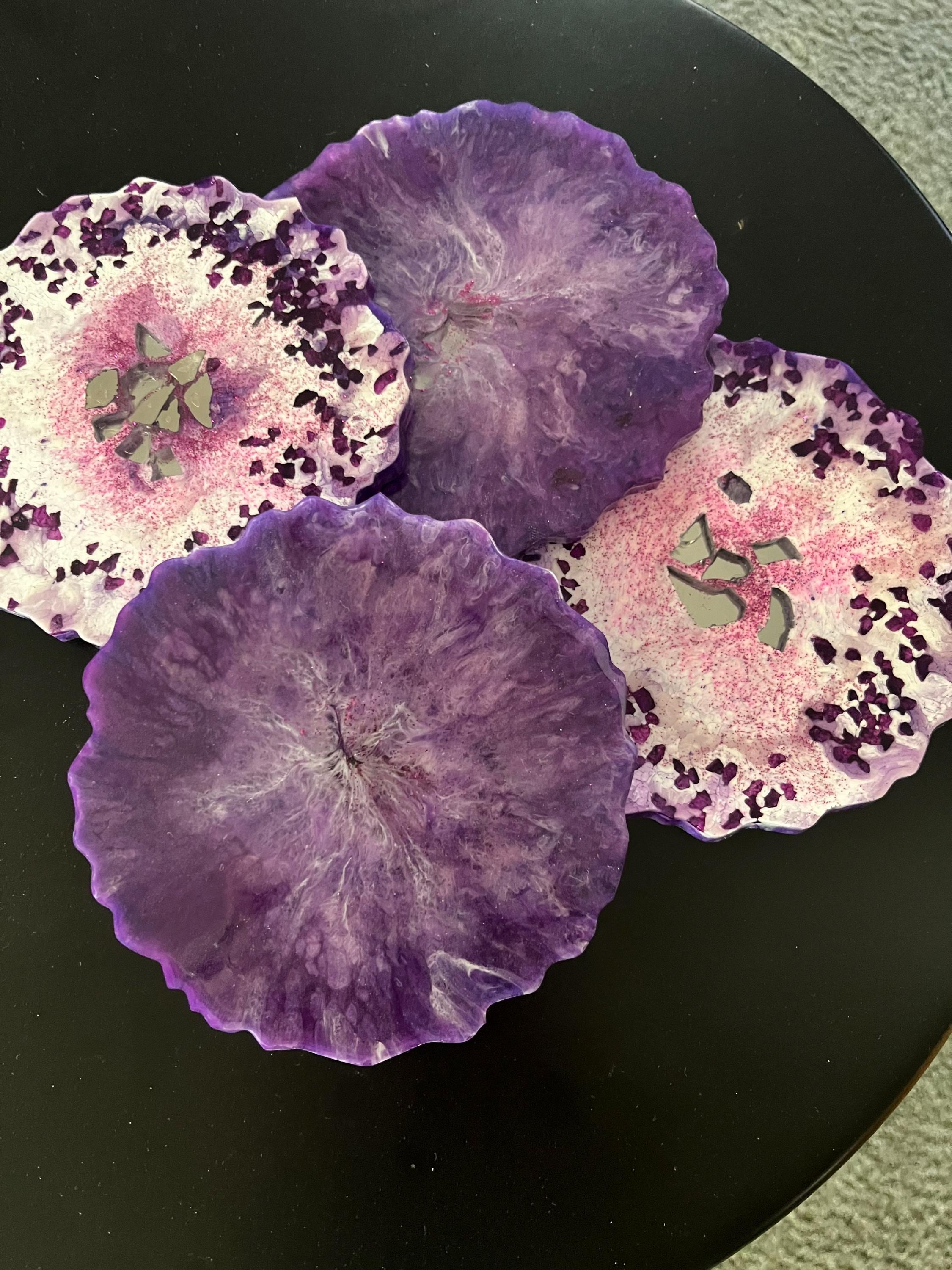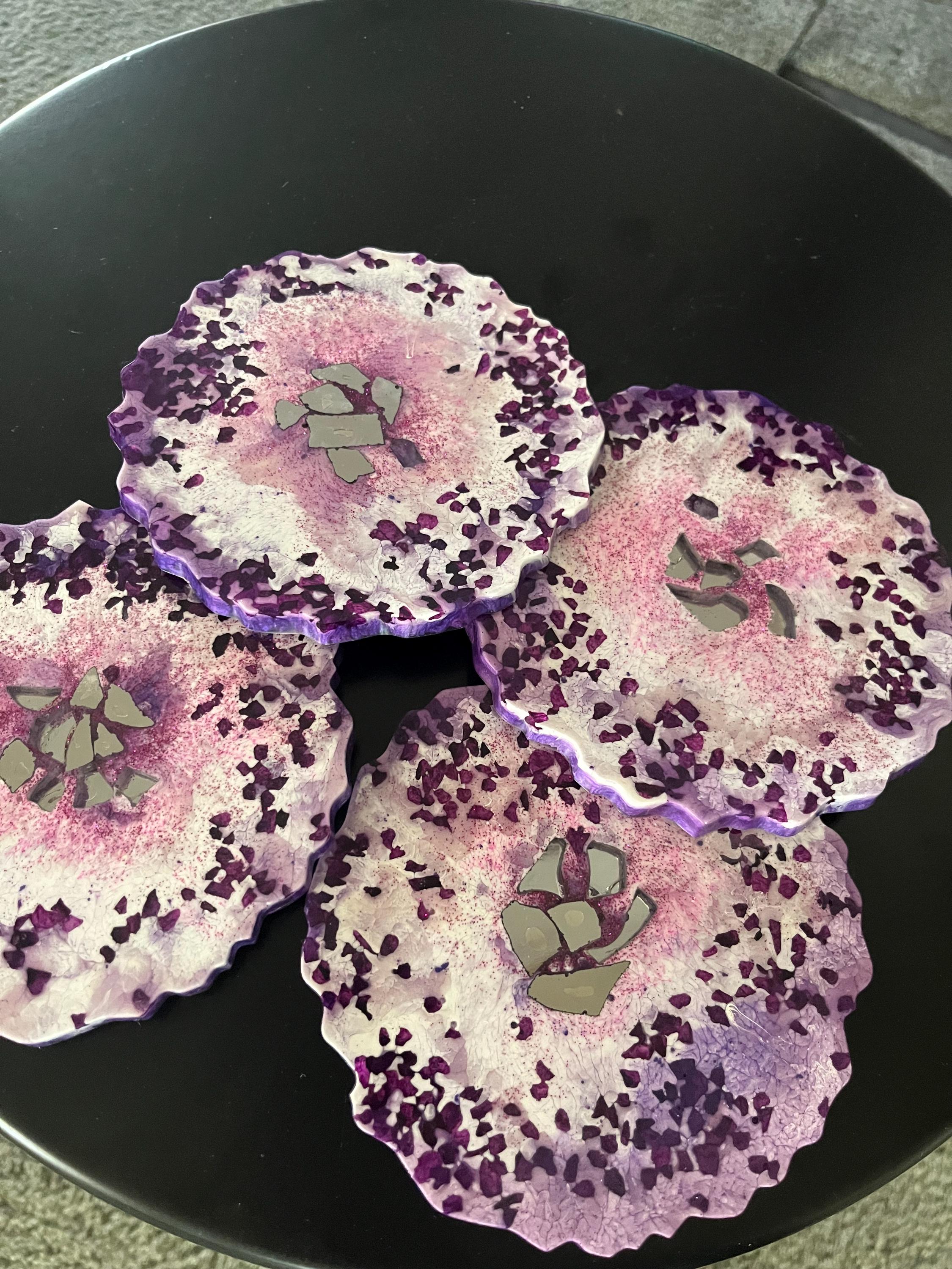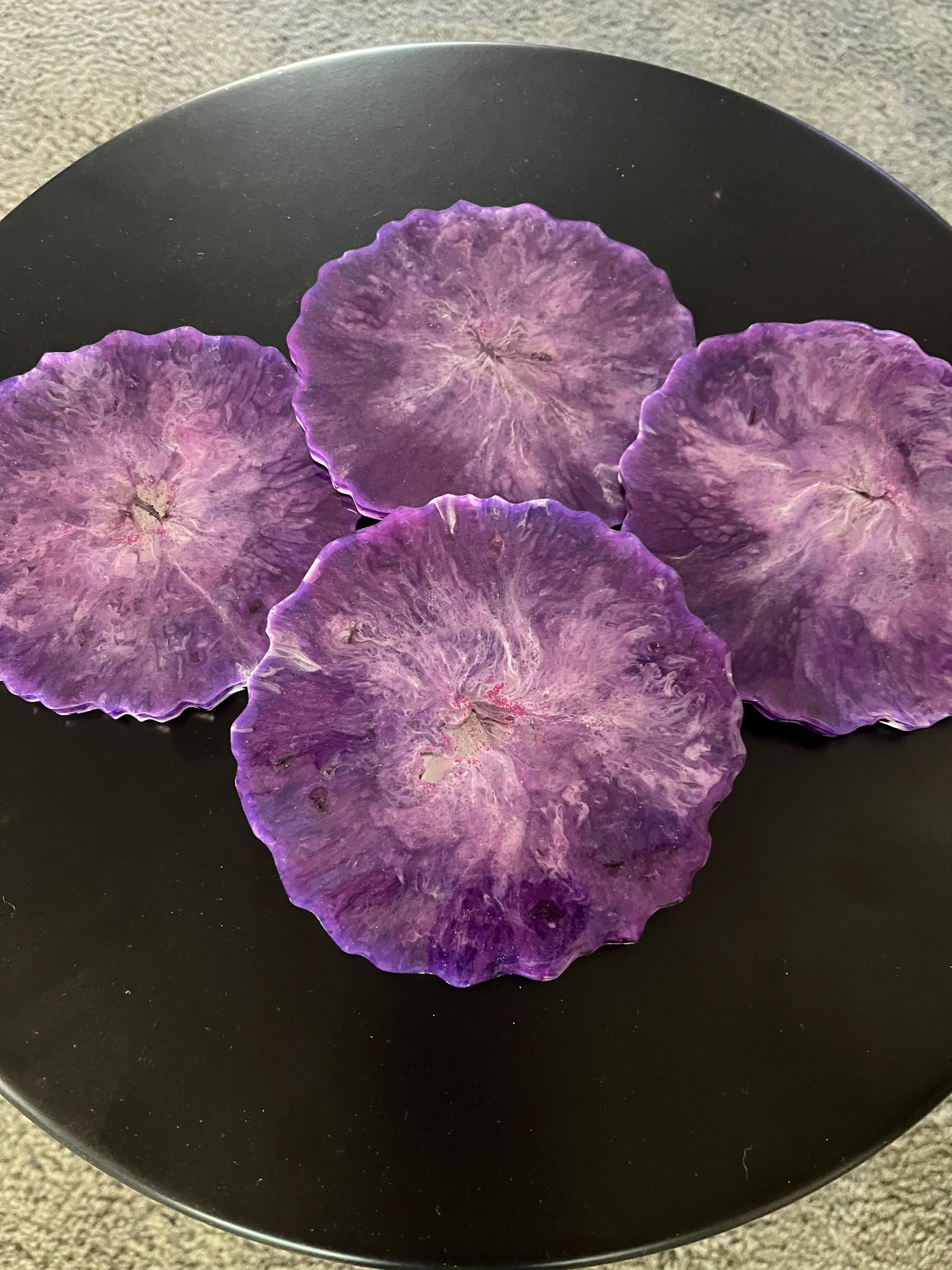 4 beautiful resin handmade coasters. 5 inch in diameter with purple, light purple, white, purple rocks, and purple glitter. Can be used either side with your preference. I will include slide stoppers that you can add to the bottom if you prefer. Both sides have a unique pattern and color I will let the customer decide! Makes a wonderful gift