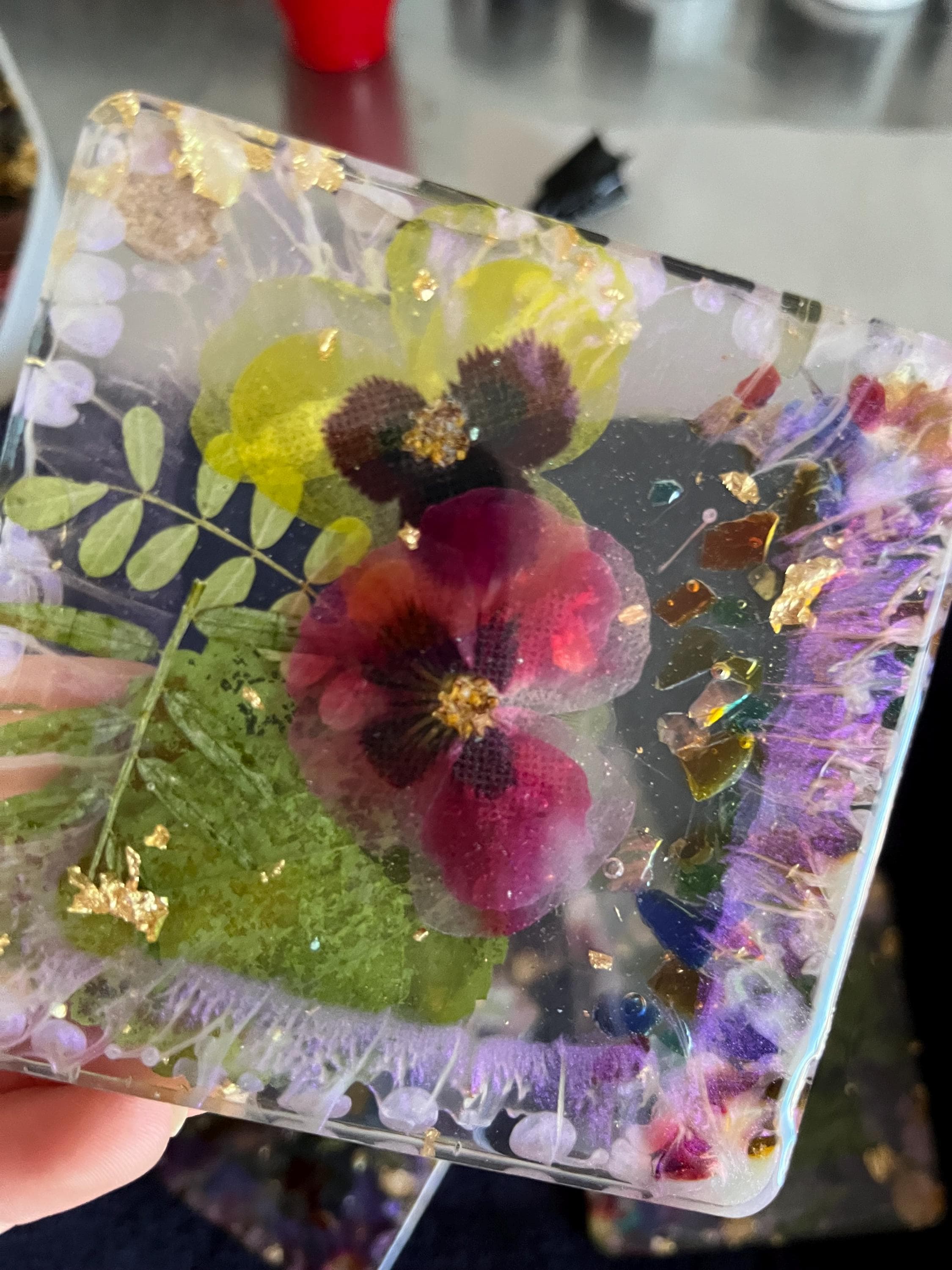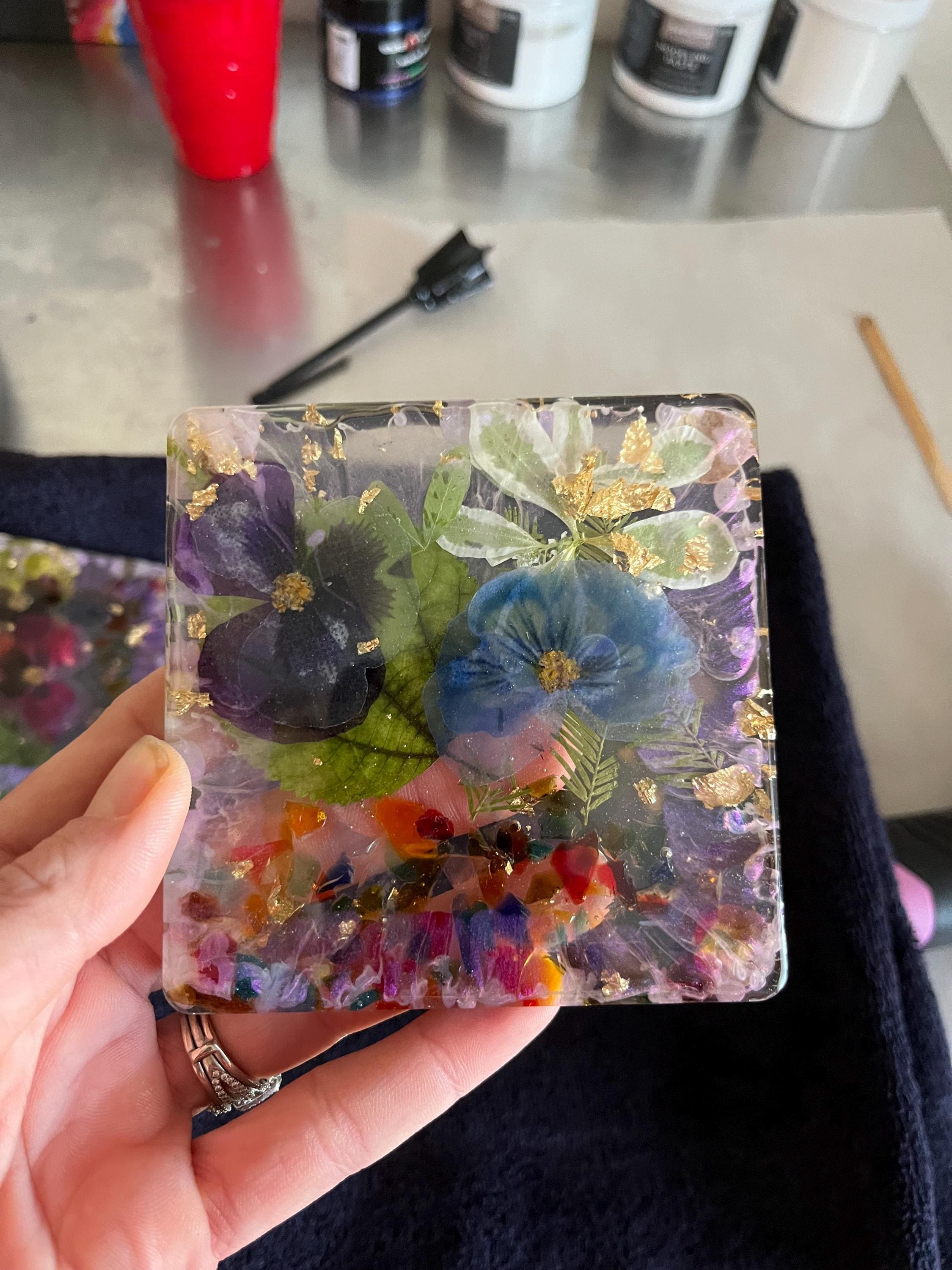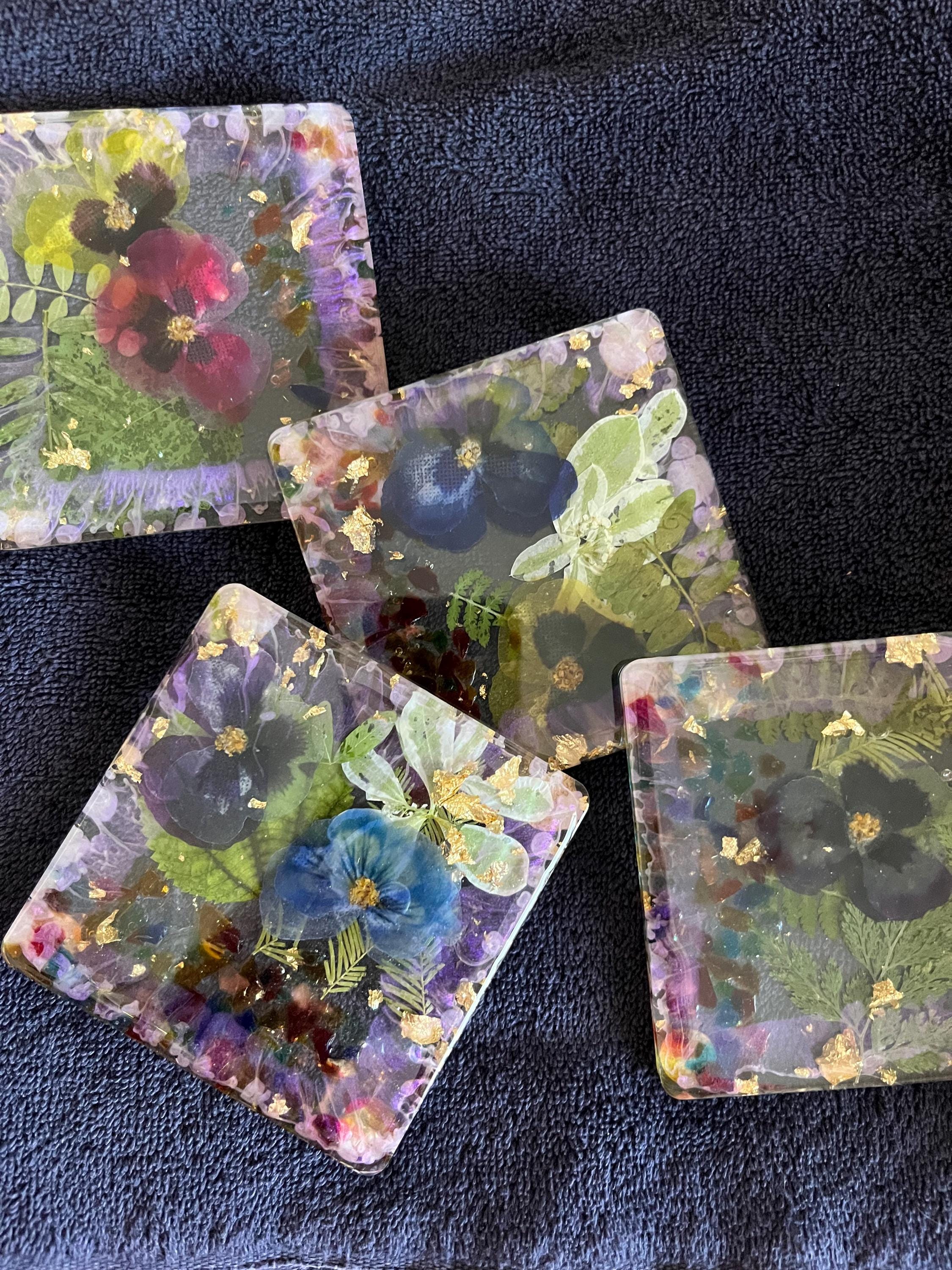 4 Resin flower and colored rocks coasters. 4 inch gold flake accent a really nice coaster.