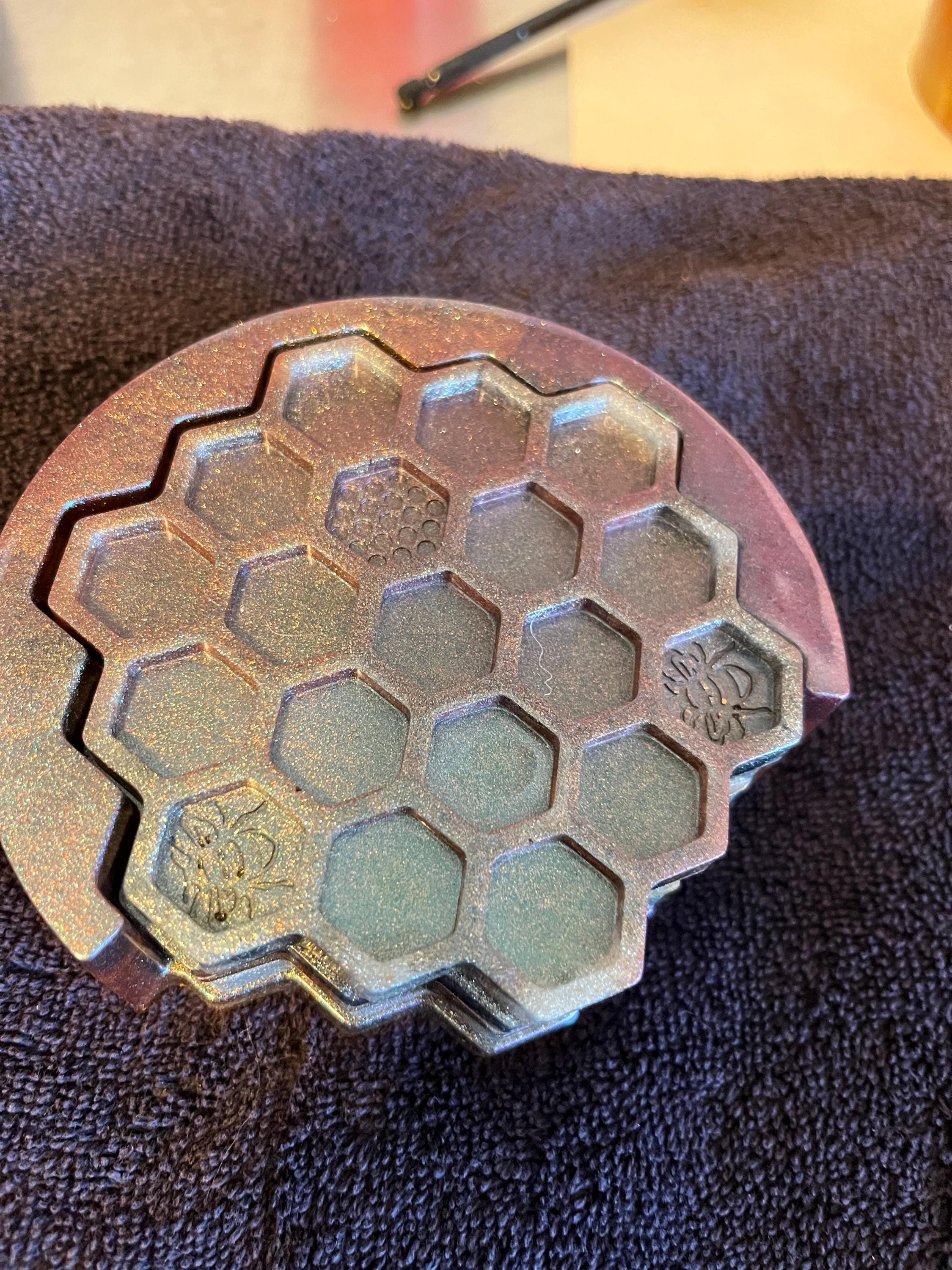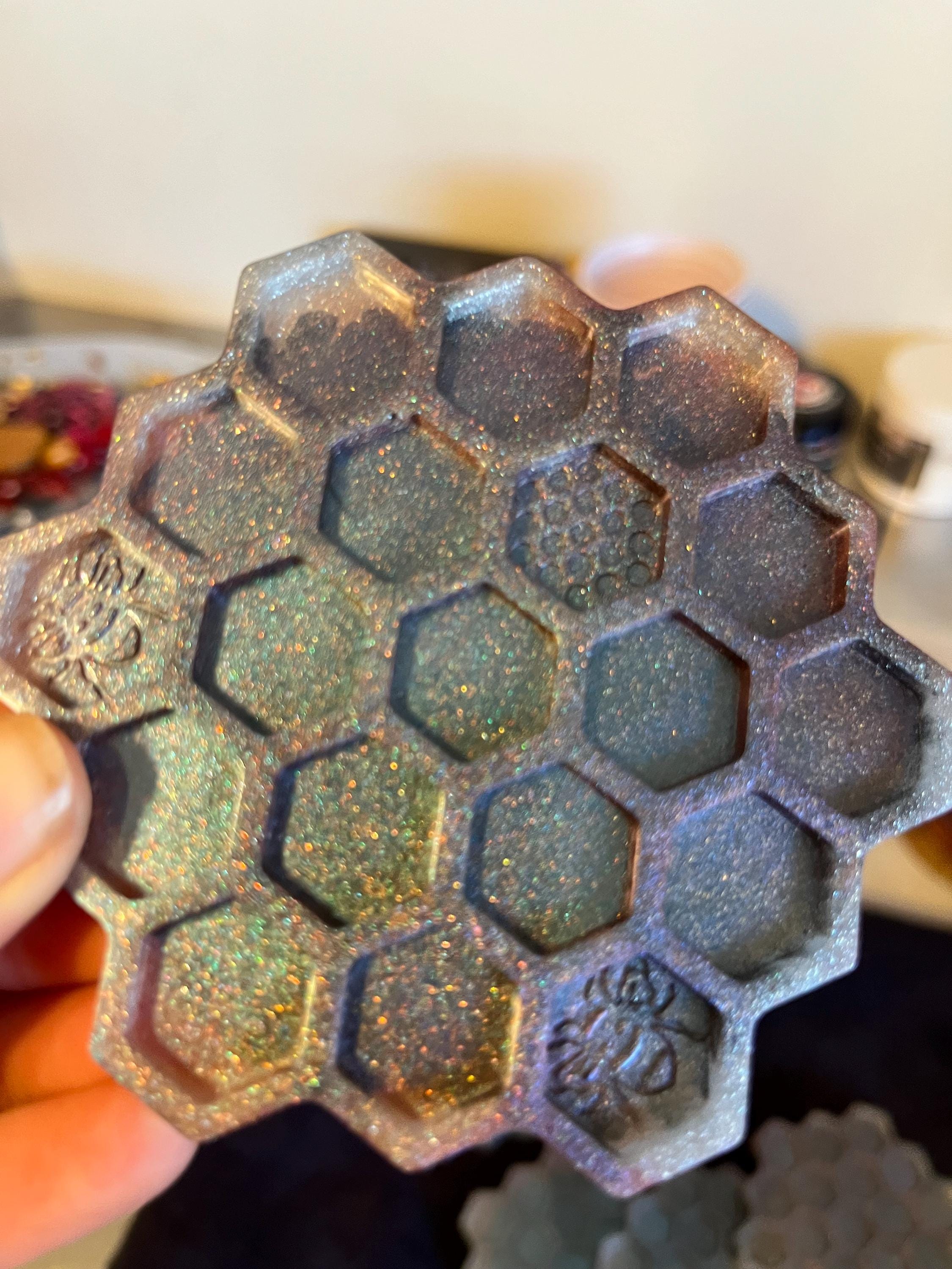 Color shift purple and green black and white honeycomb coaster set. Looks different in light. Beautiful fun set.