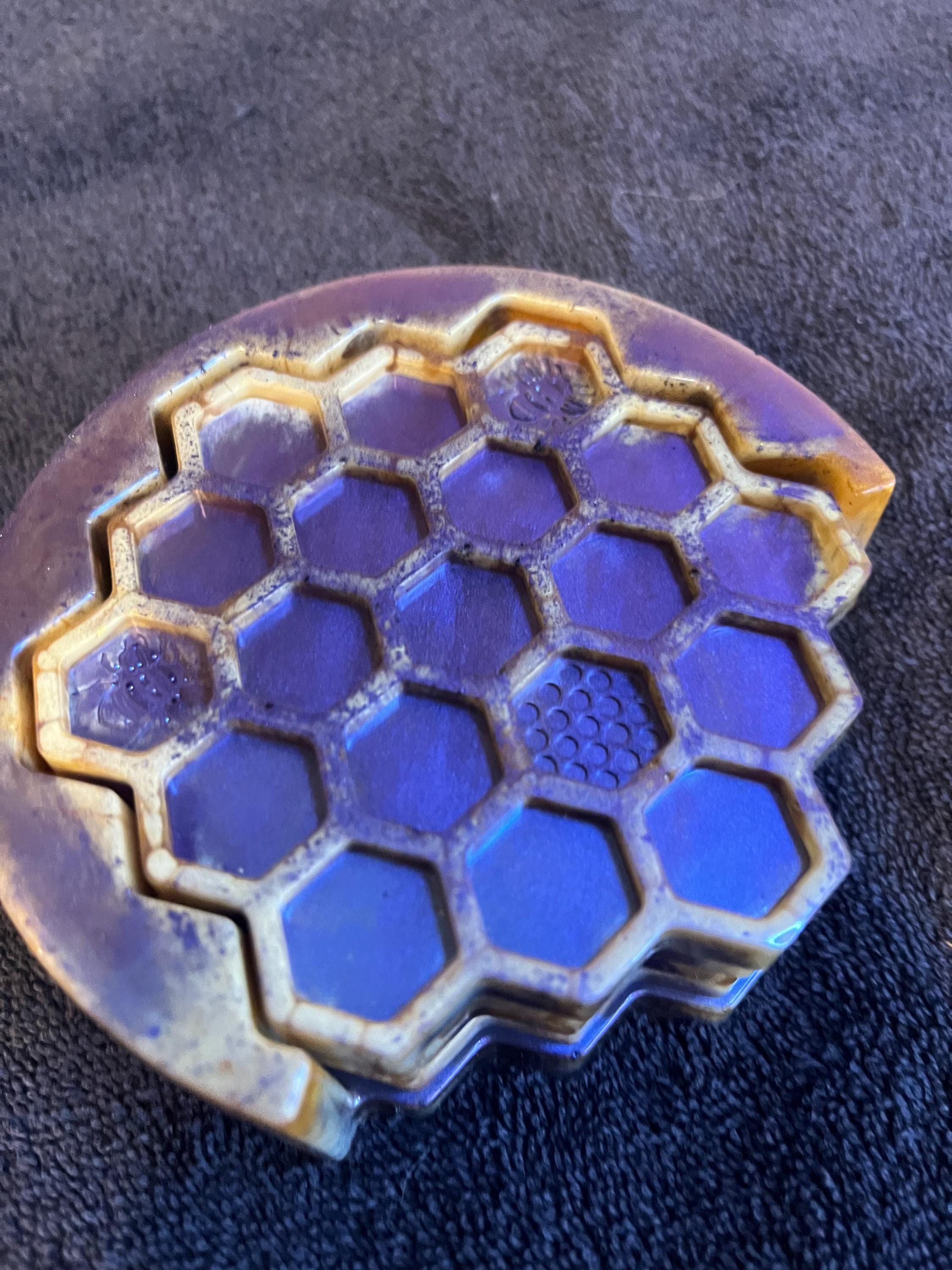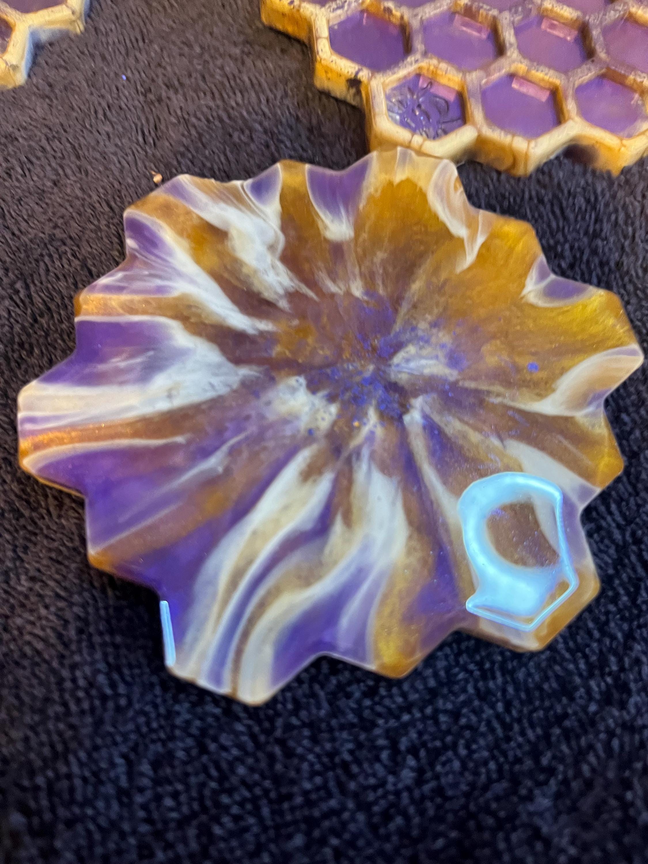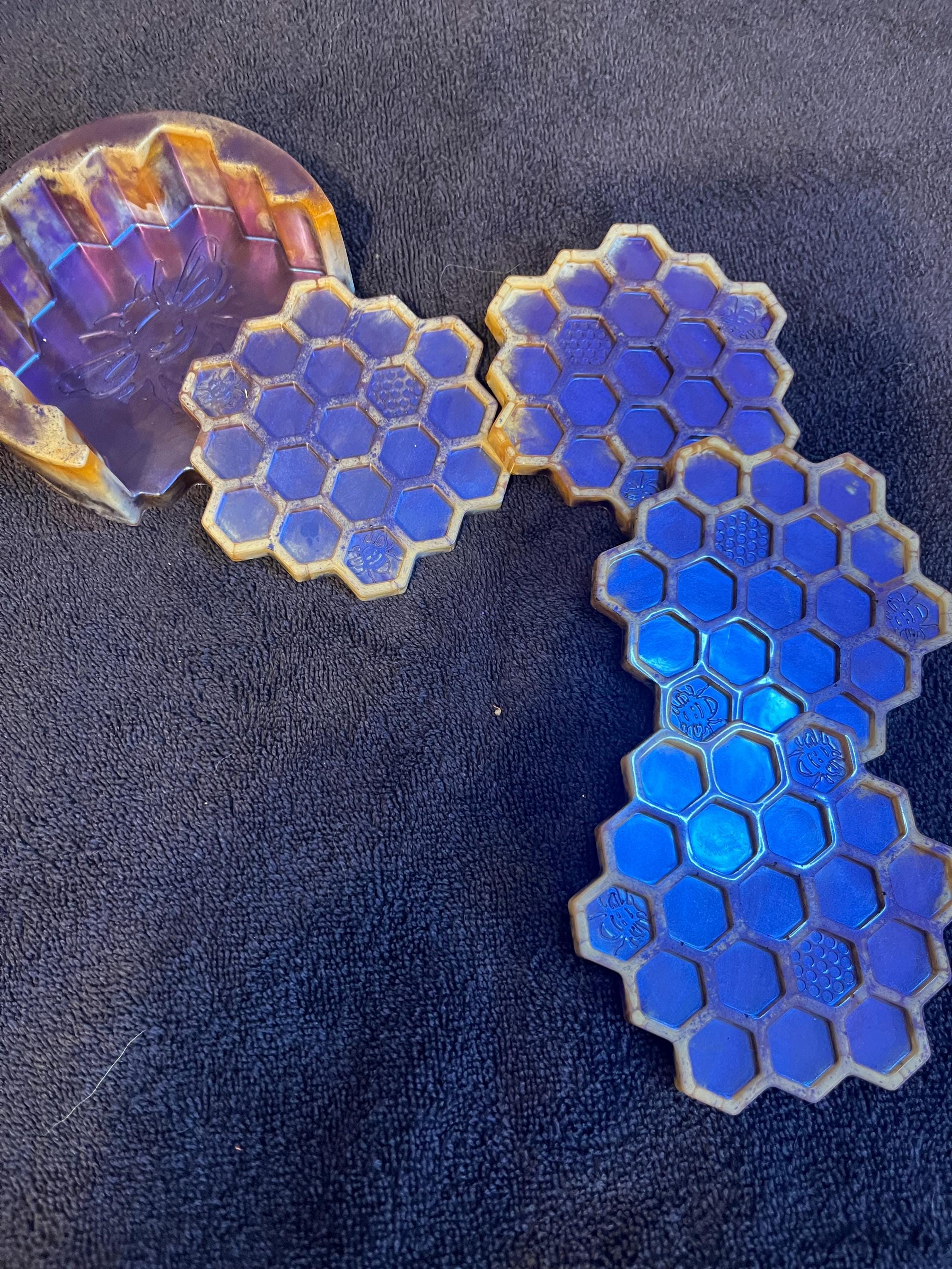 Purple, blue, gold, and white honeycomb coaster set with holder