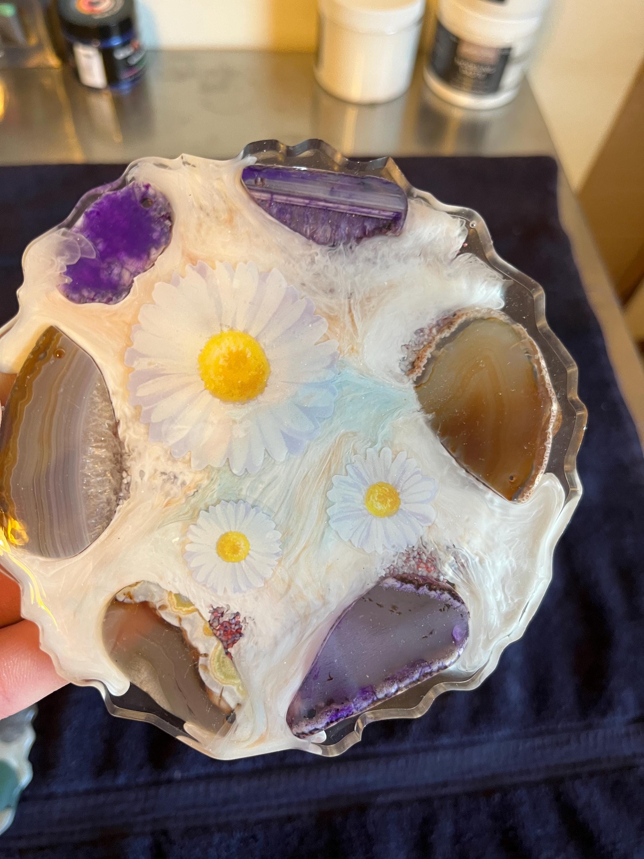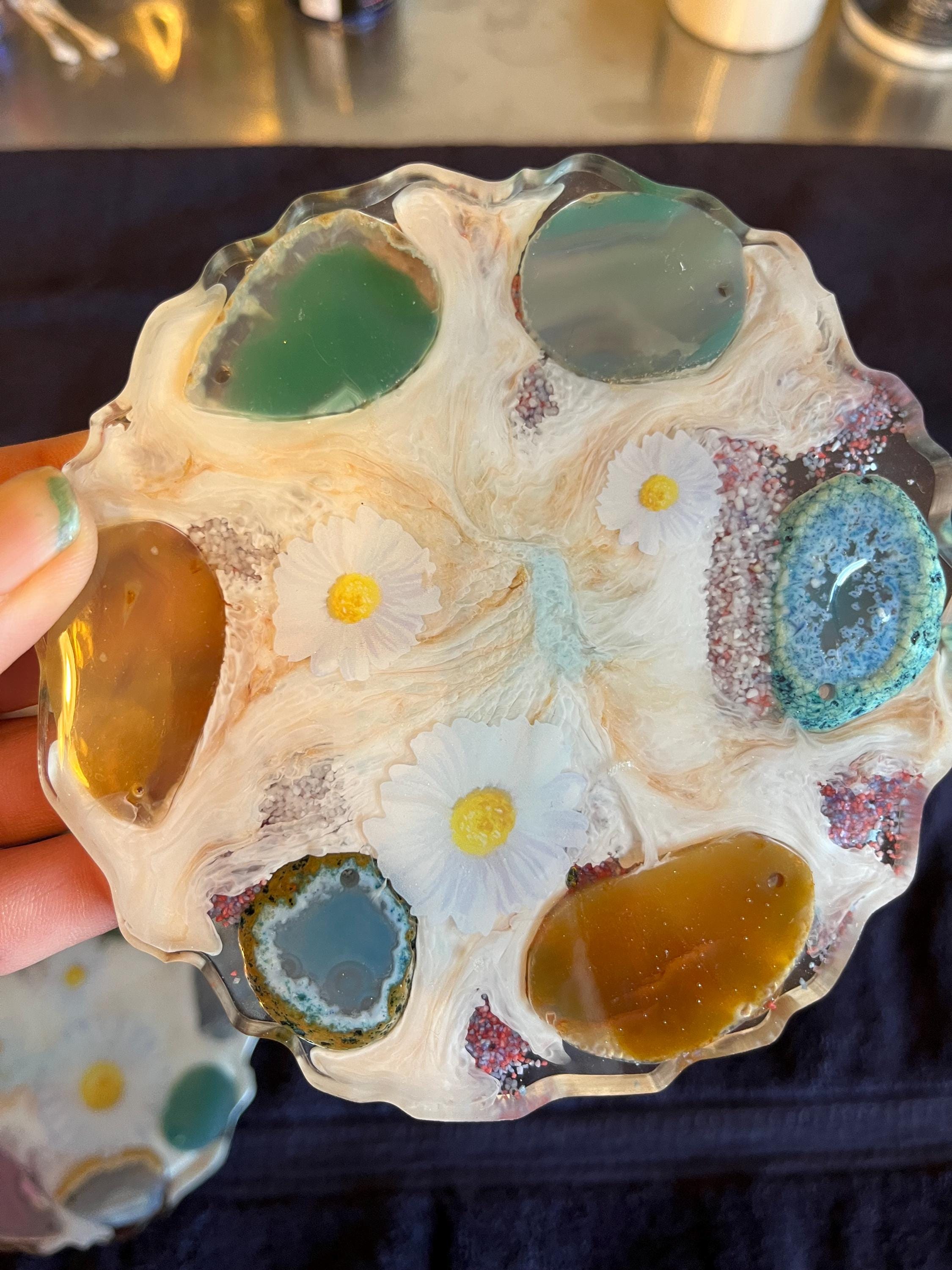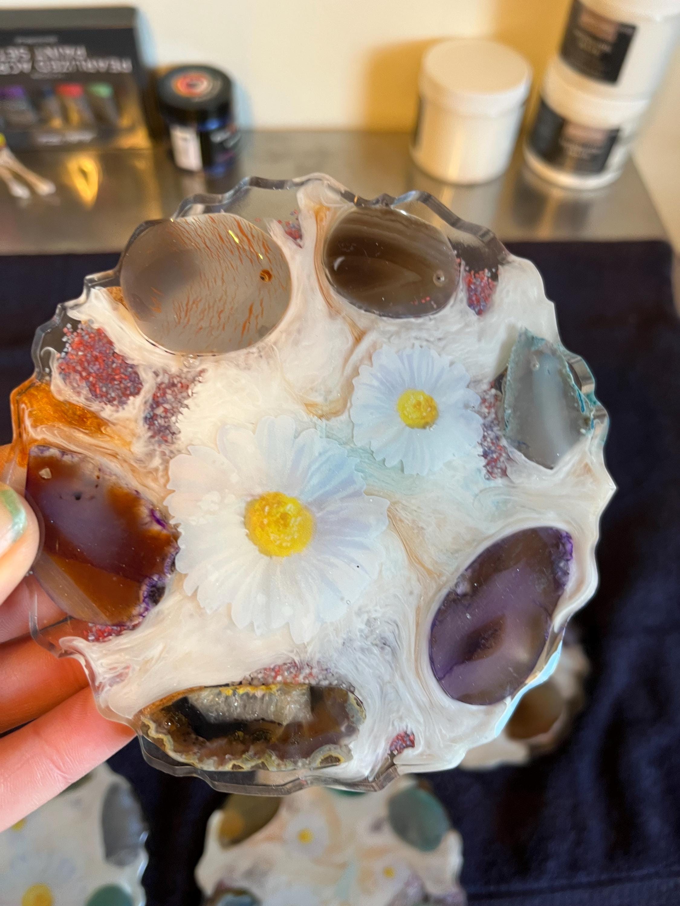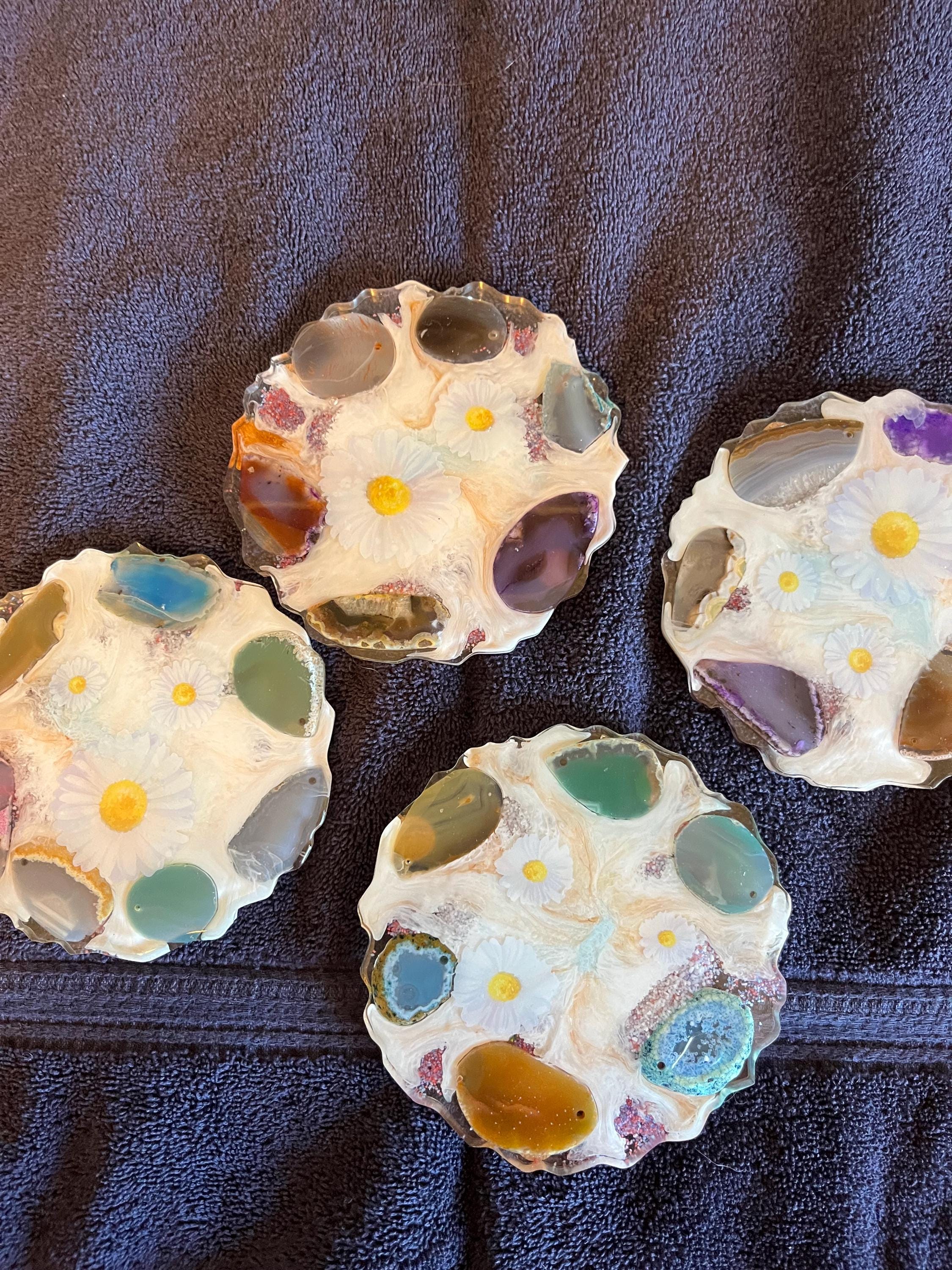 Set of 4 coasters 5 inch in diameter decorated with geode rocks and daisy flowers.