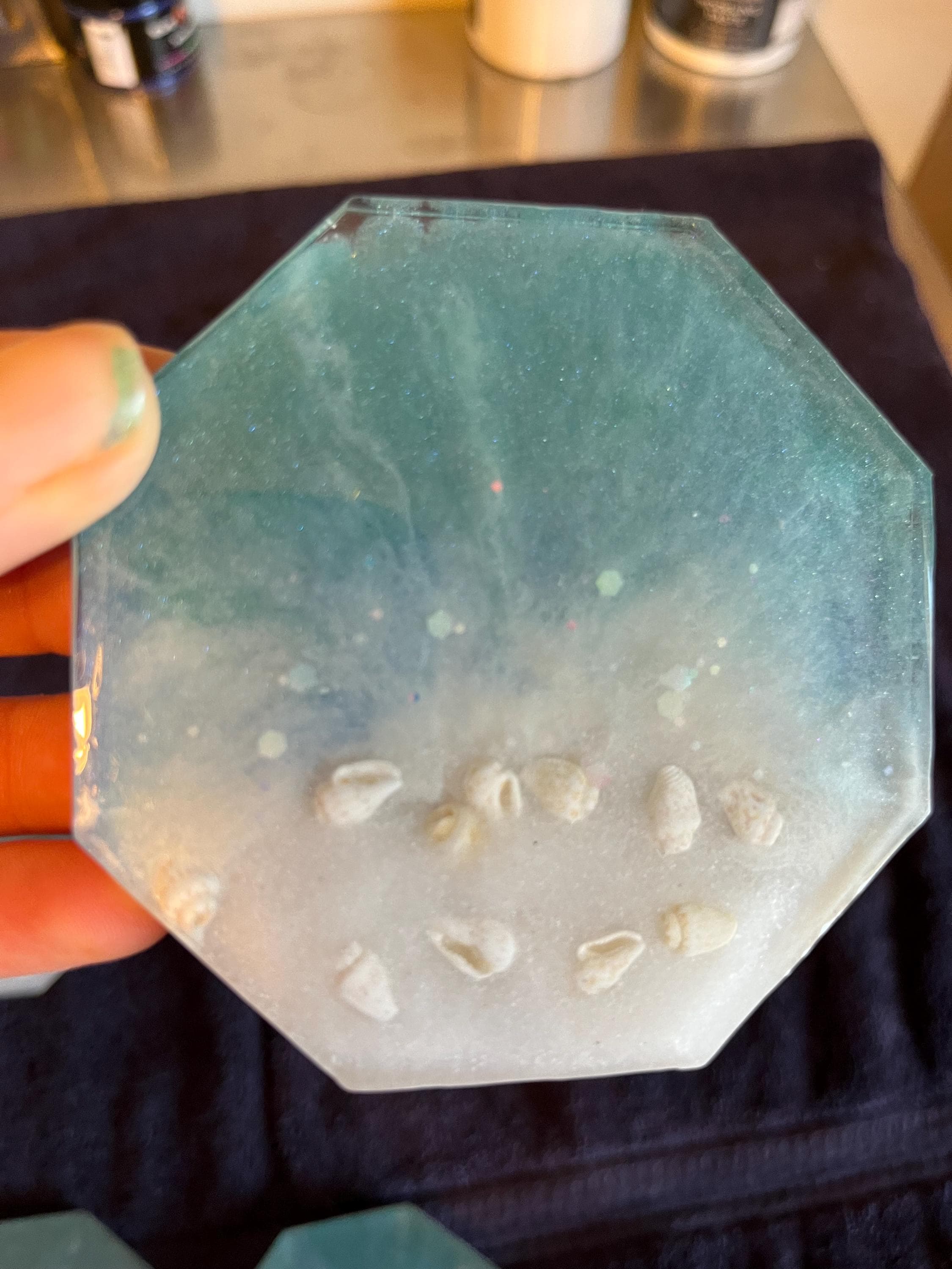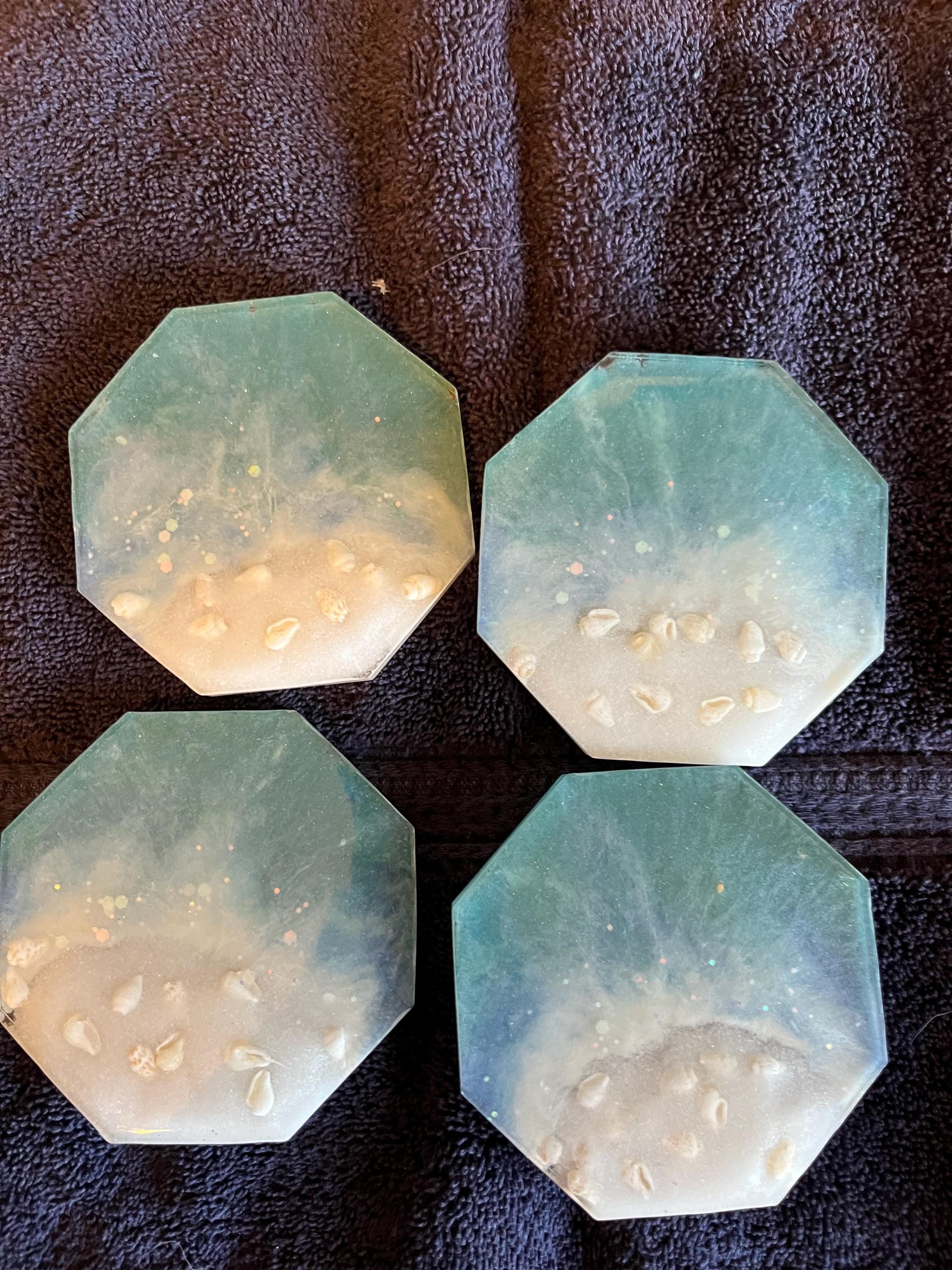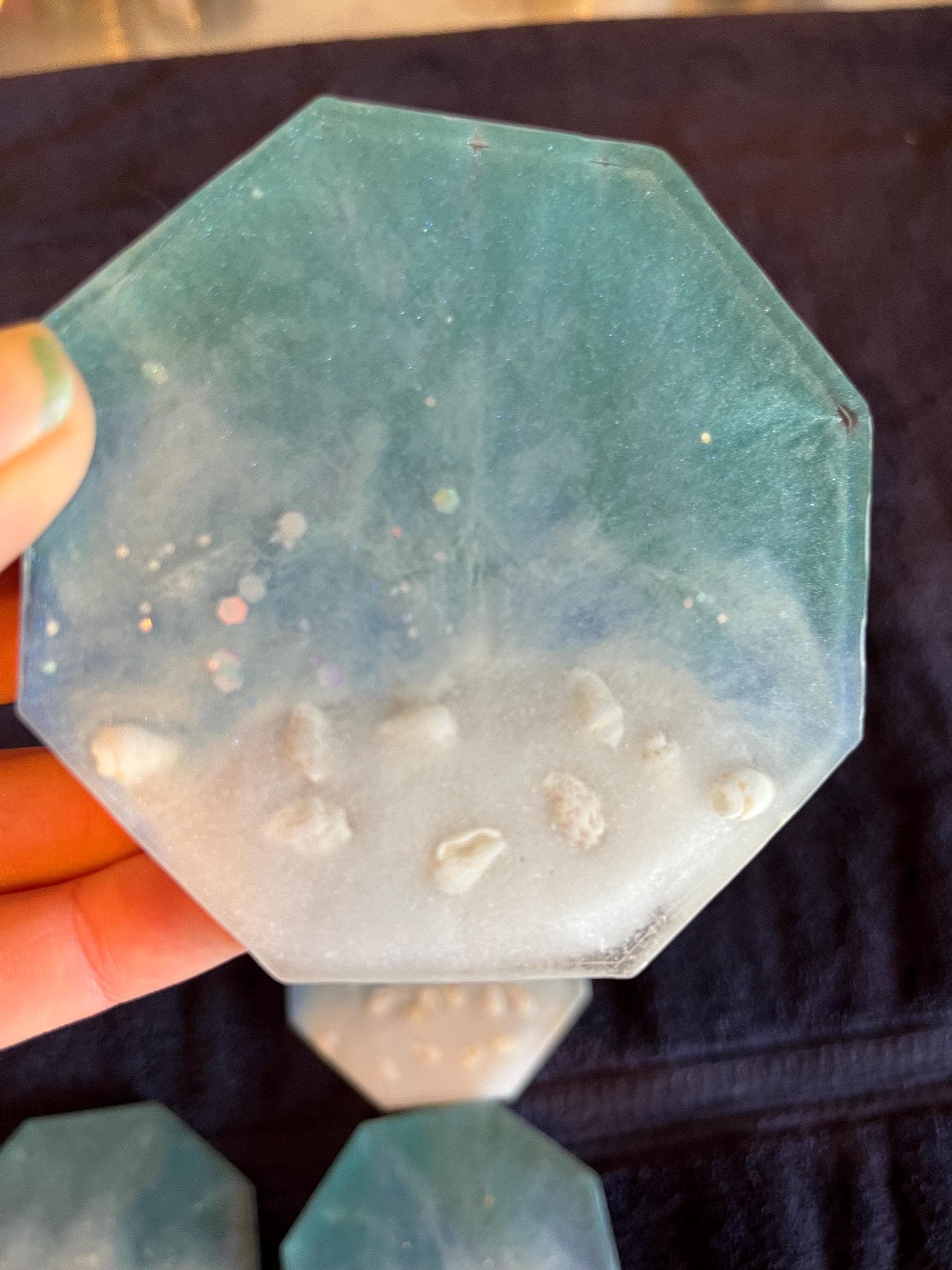 Resin beach coaster set of 4. Super cute with shells and light colors of blue and white.