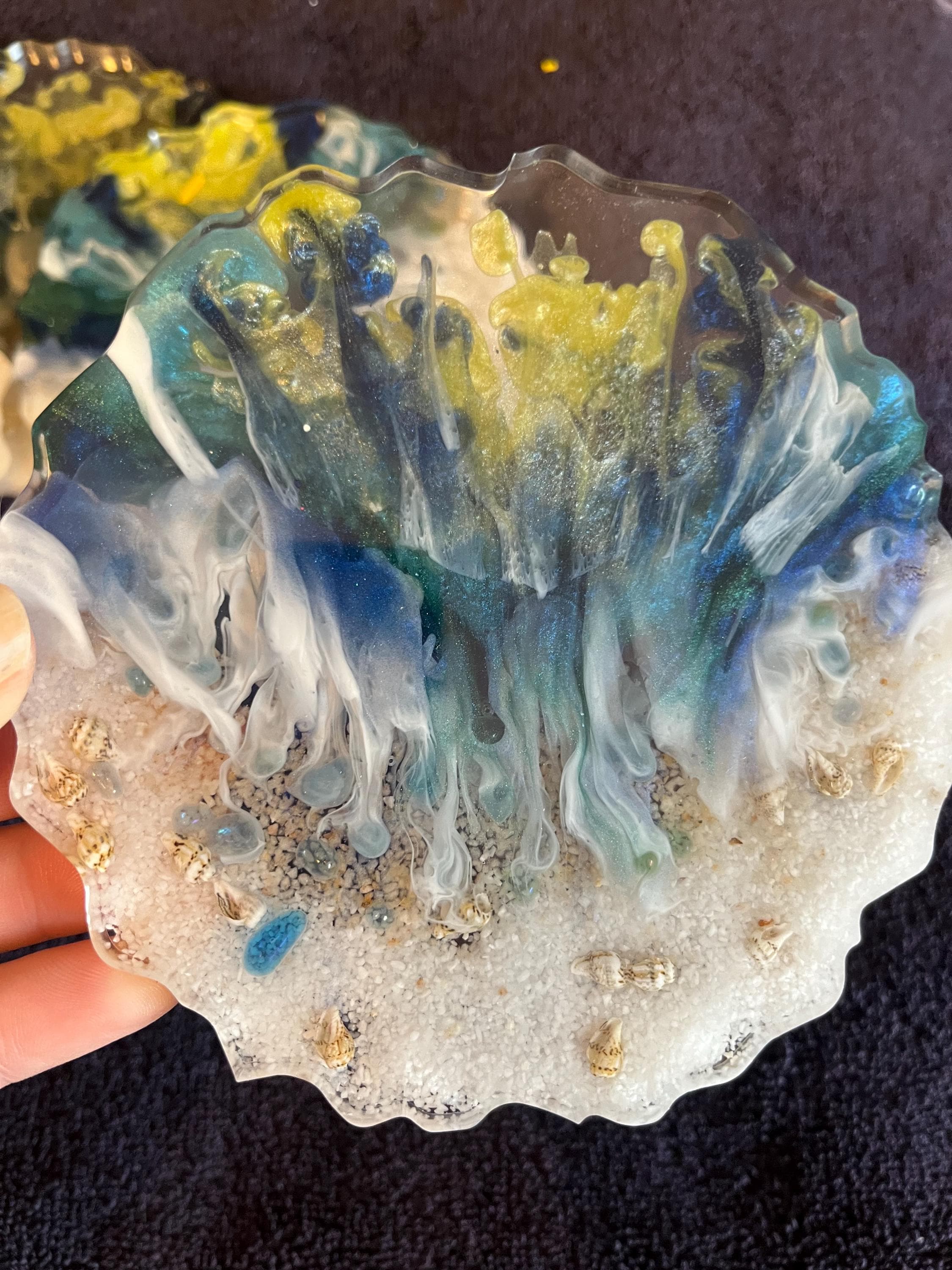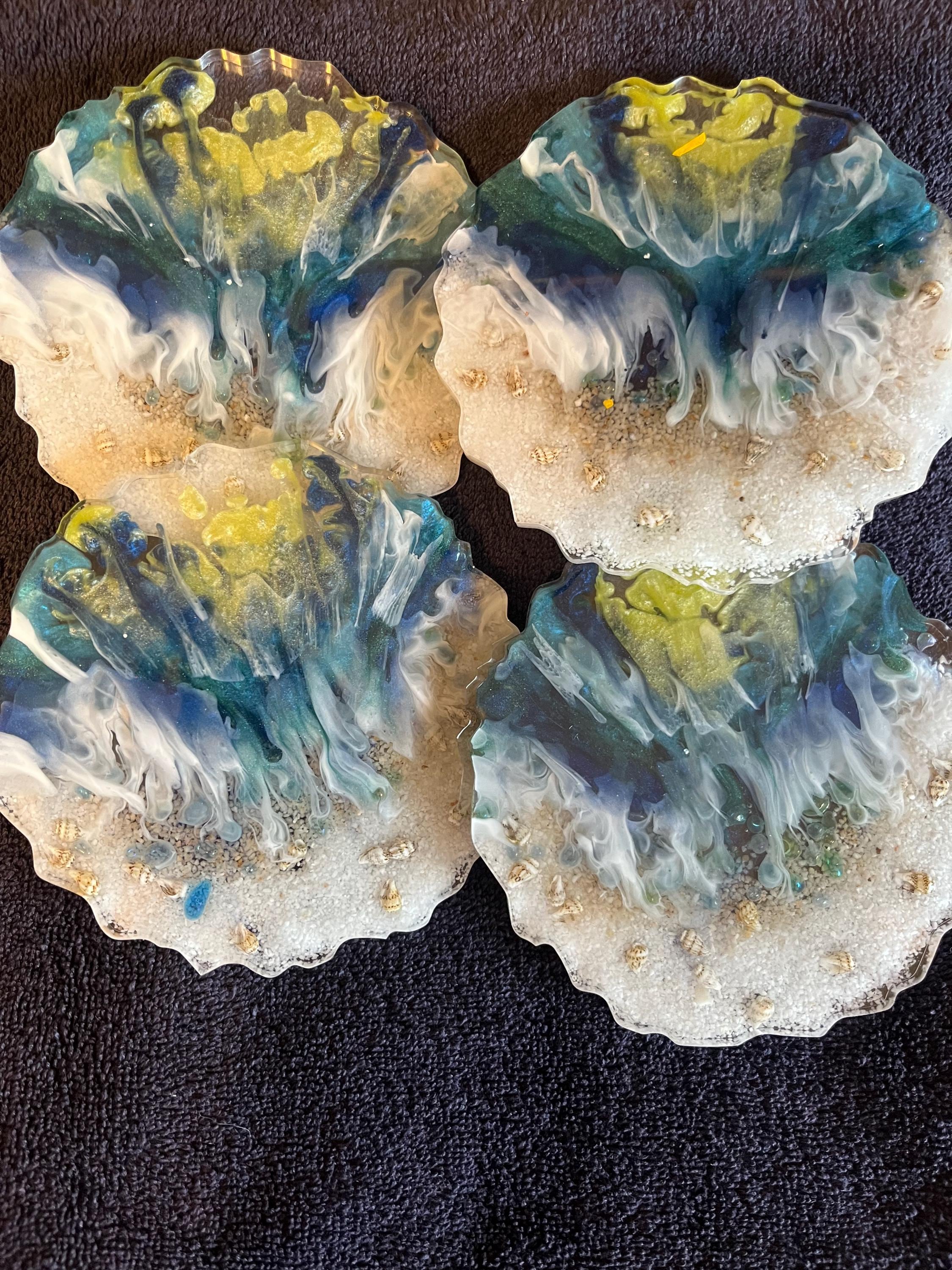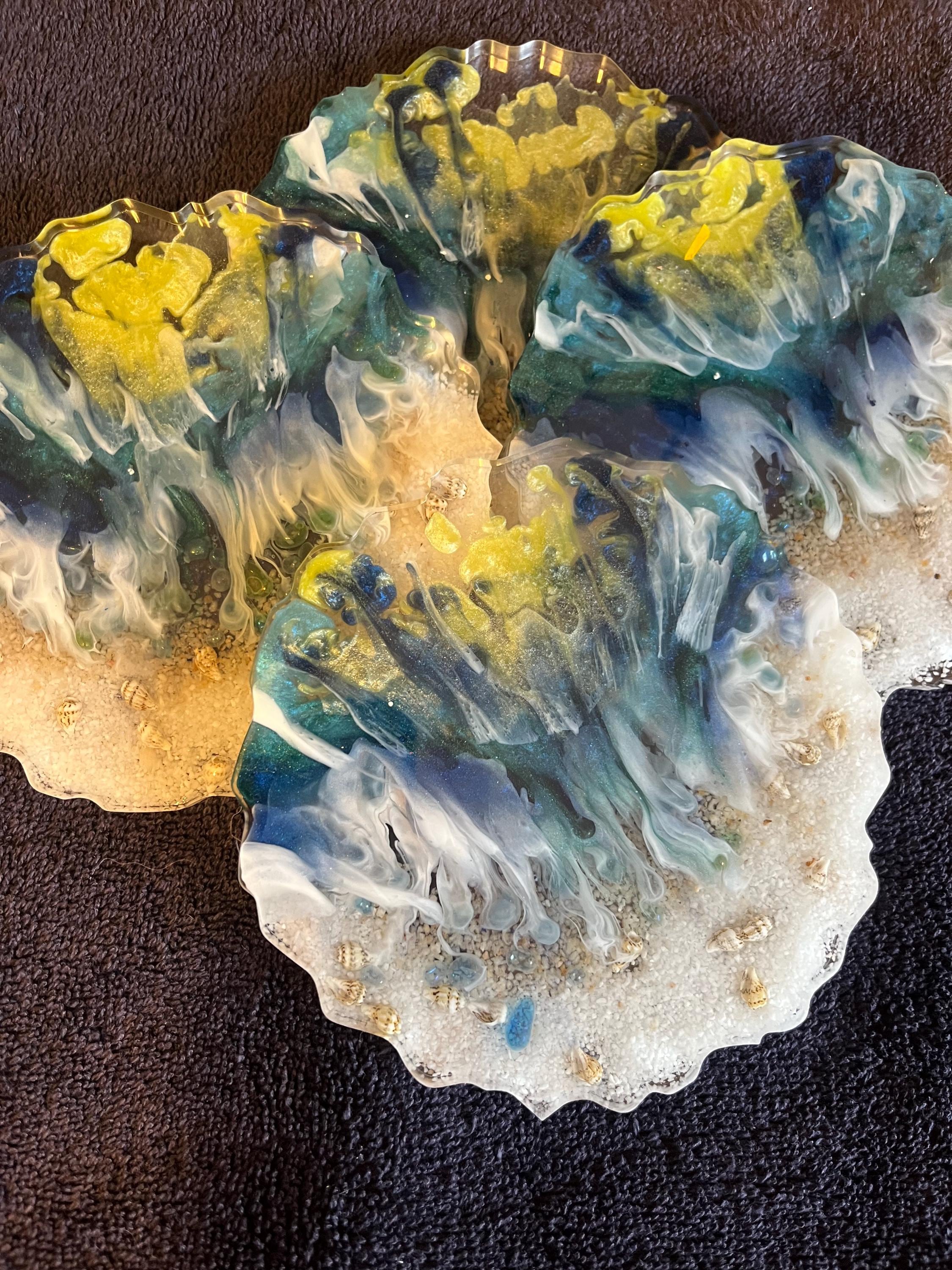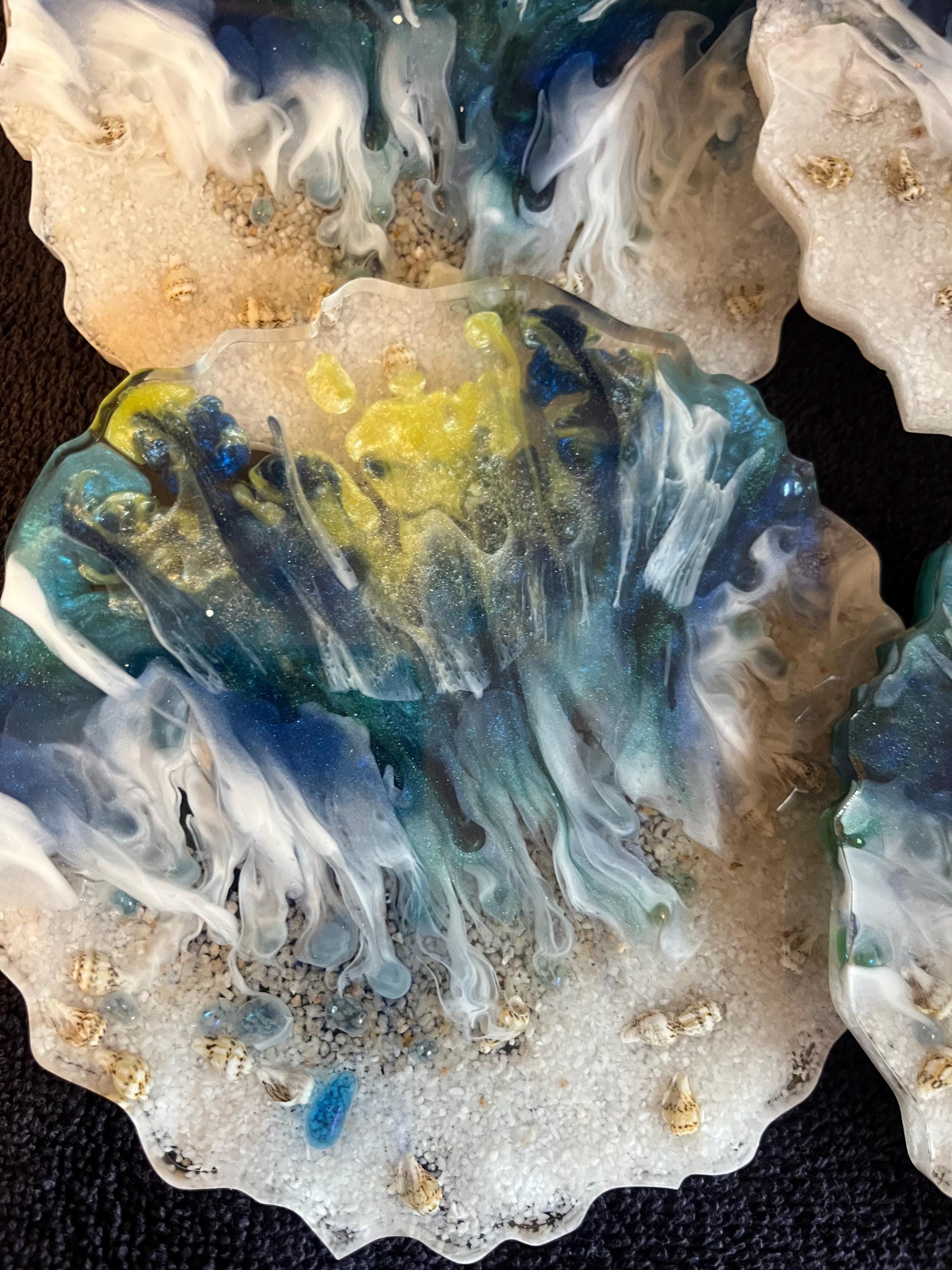 4 resin beach coaster set 5 inch in diameter with sand and shells