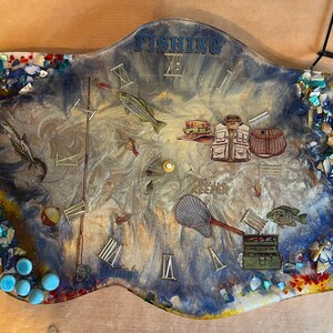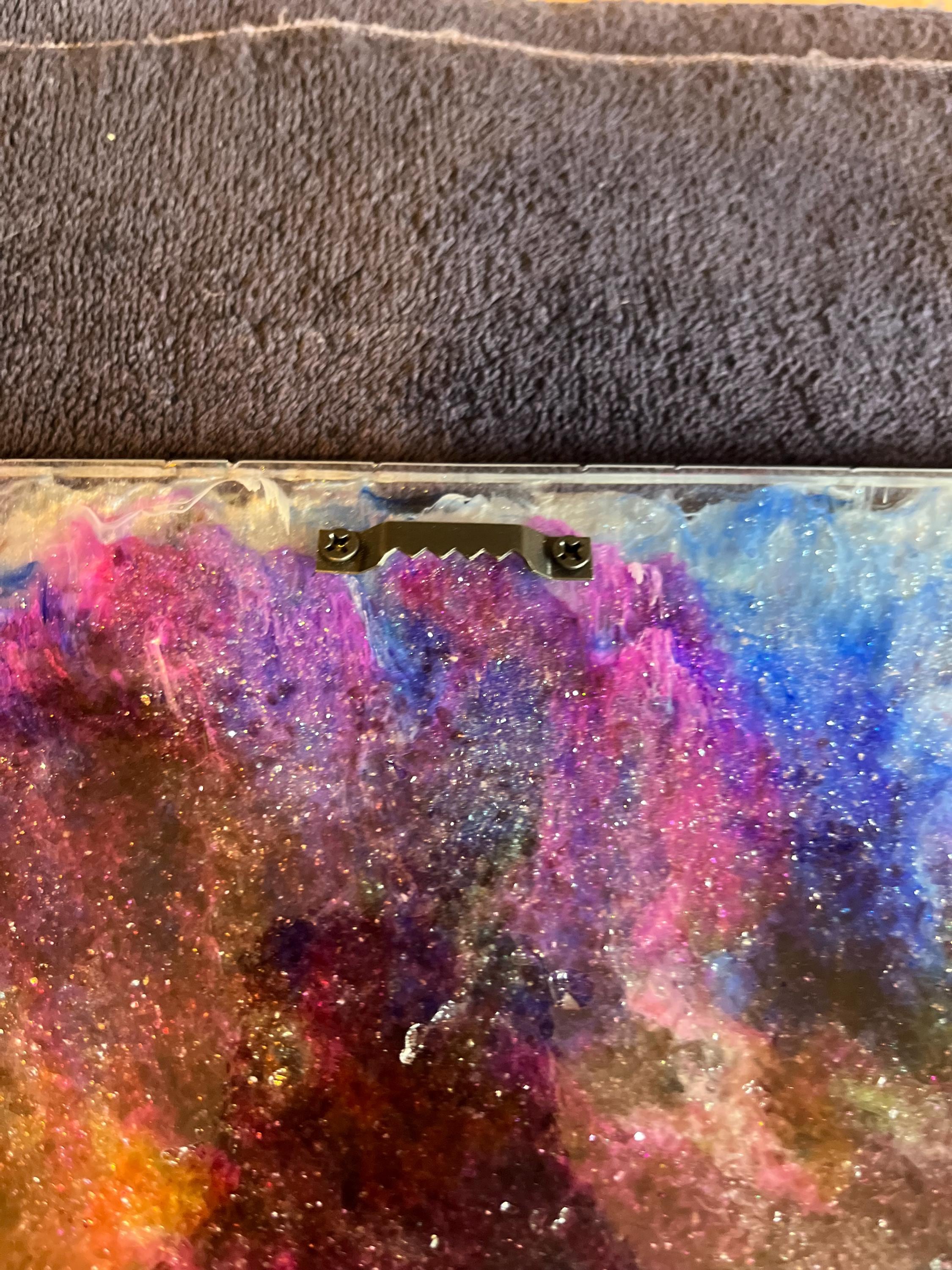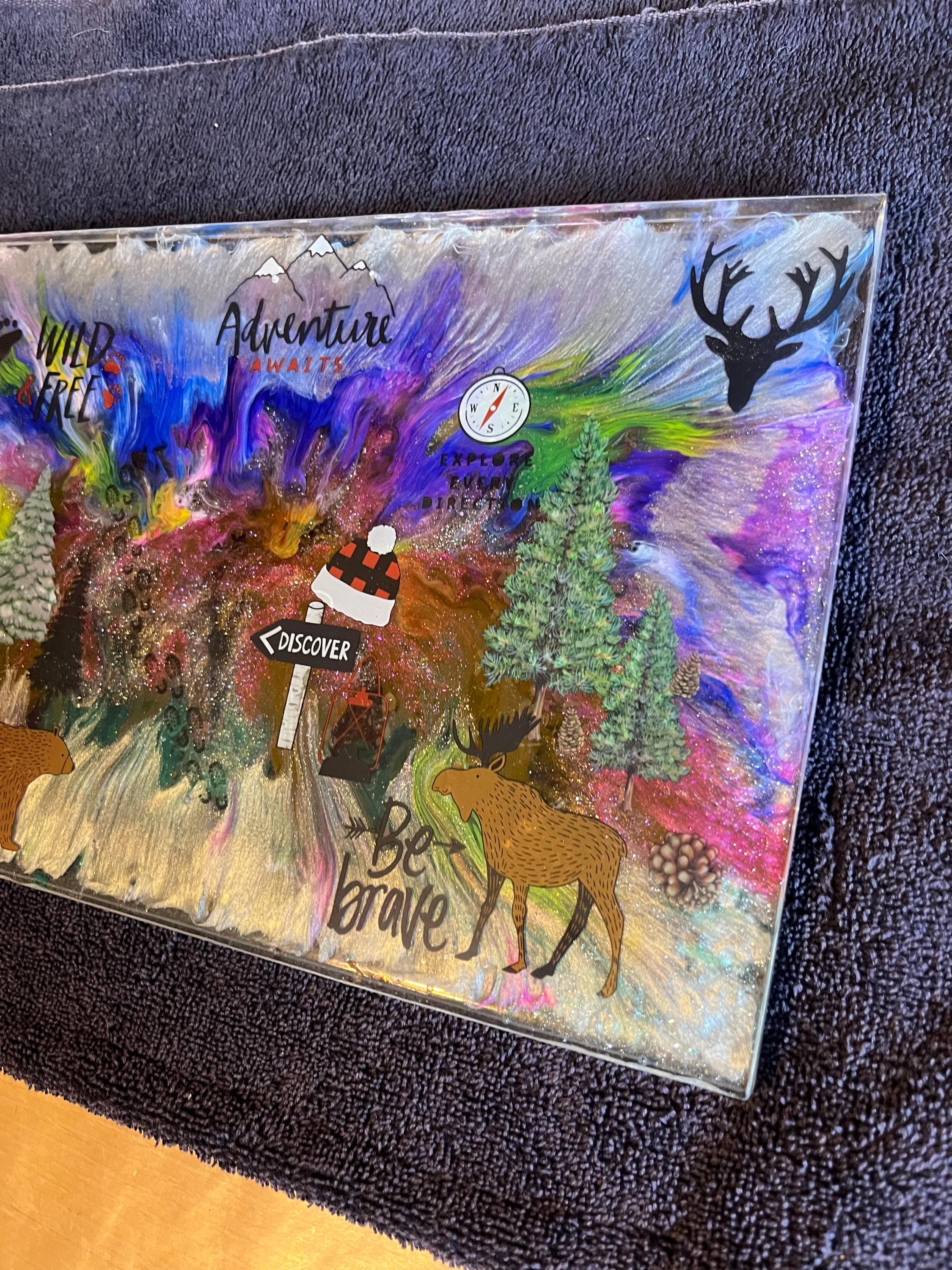12 inch by 8 inch resin wild and free resin wall hanging with animals trees and other decals. Colors are purple blue green silver and white