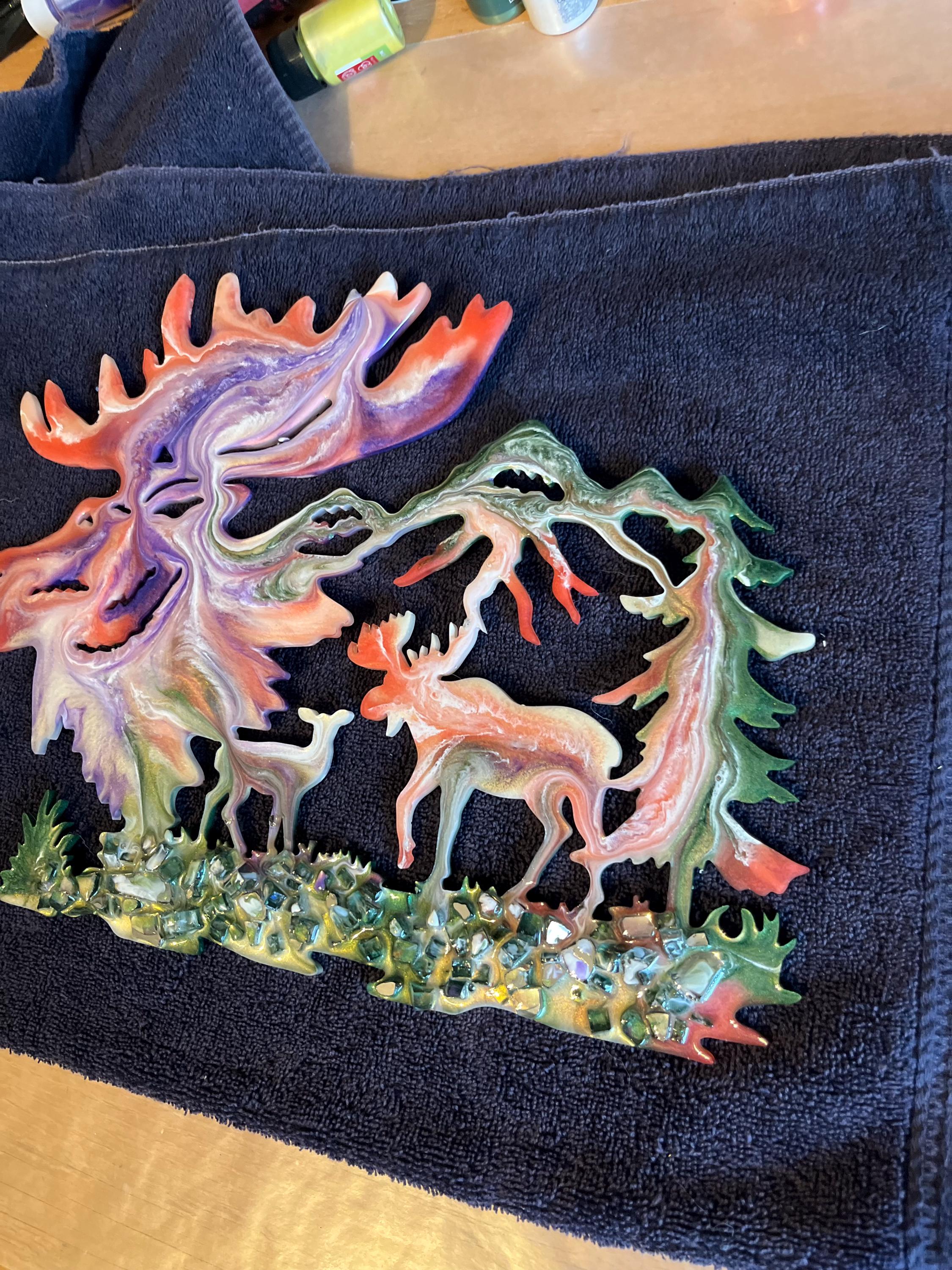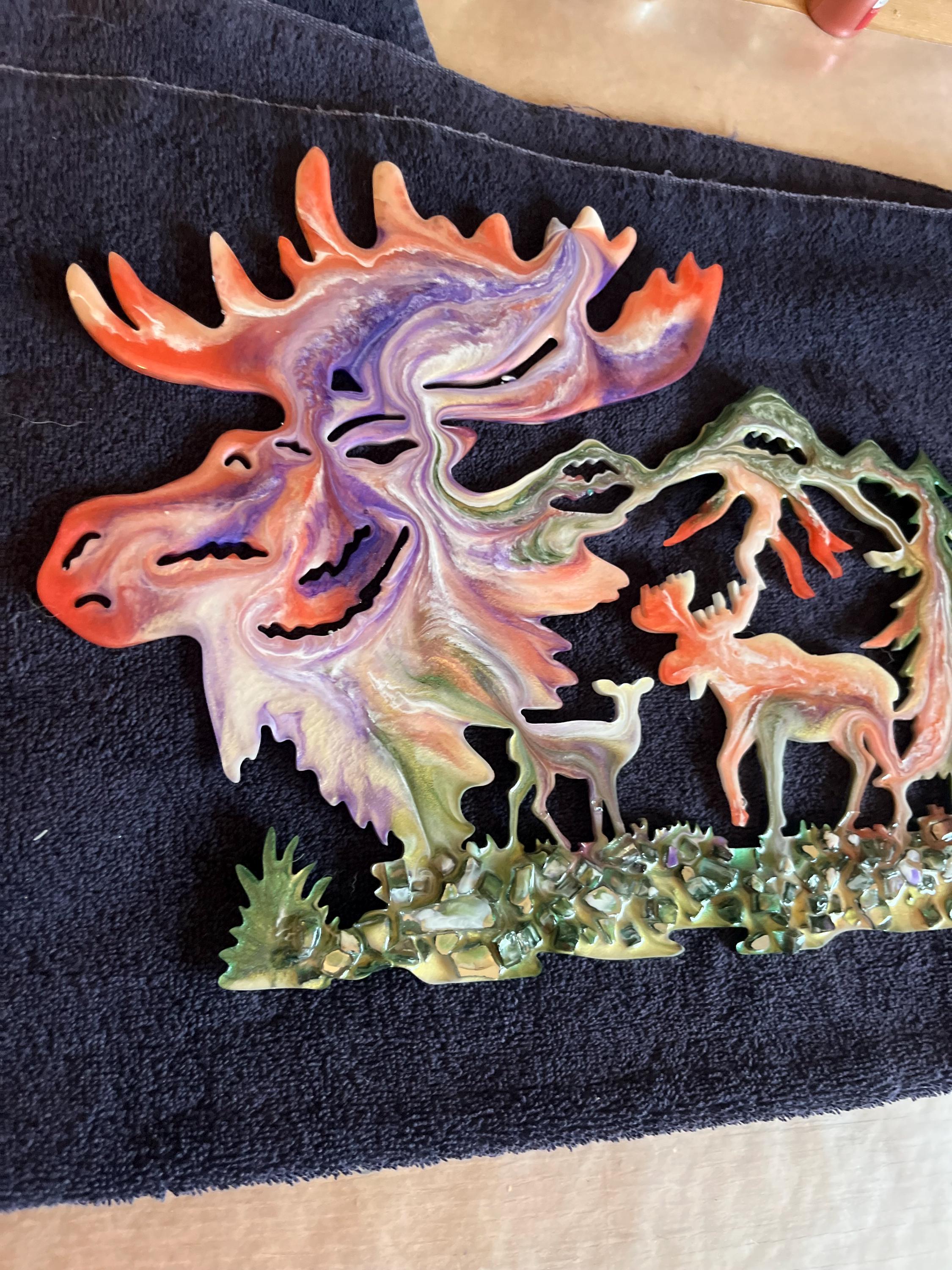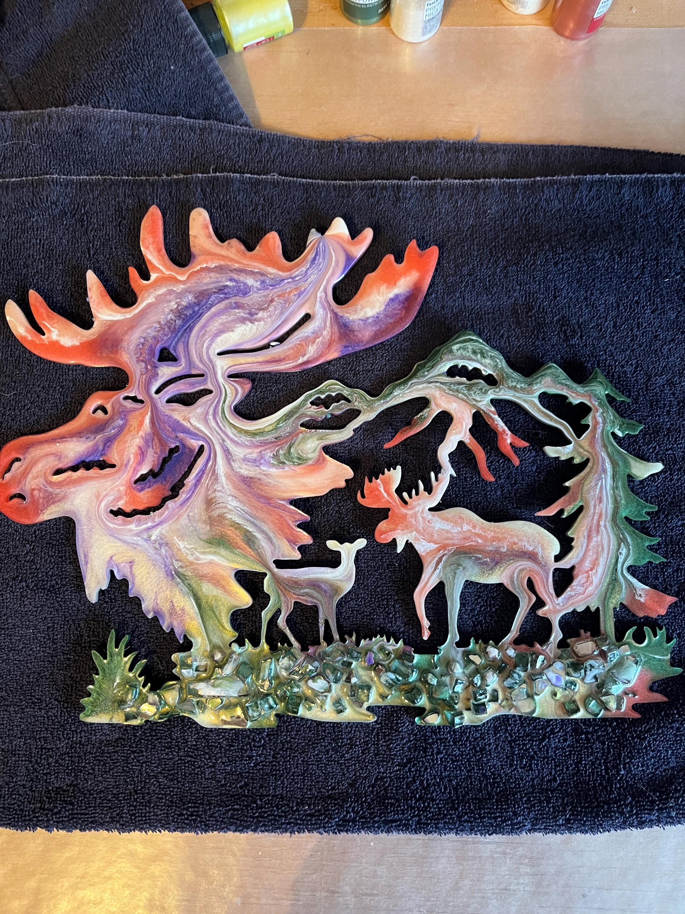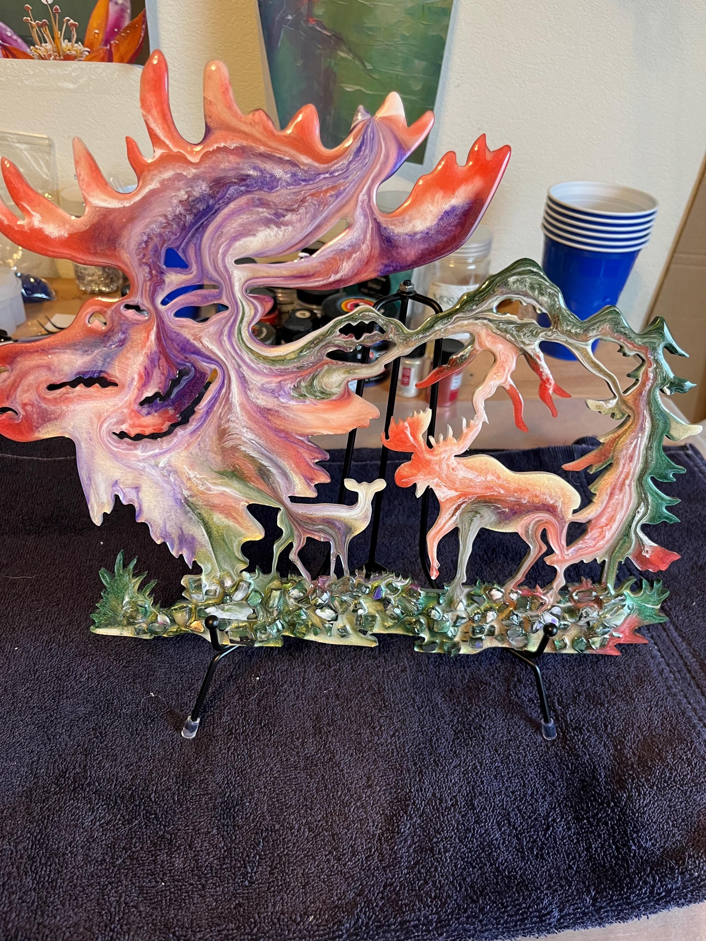 13 inch by 10 inch wall hanging or item for a stand moose and deer art. Colors include peach, purple, white, green yellow